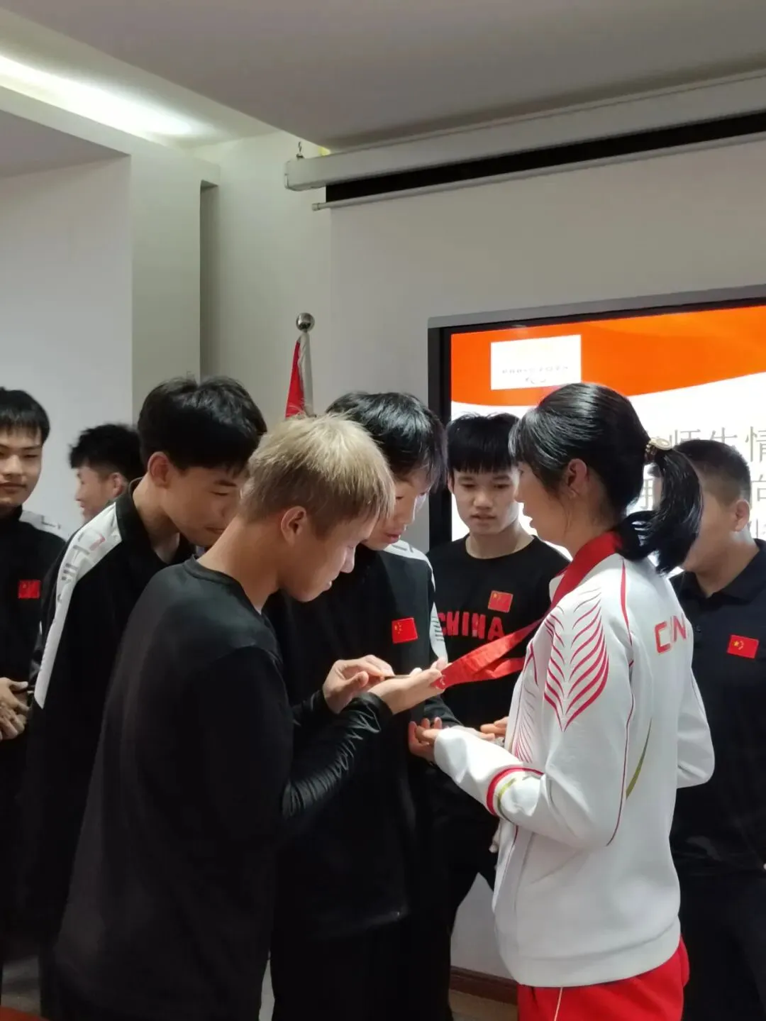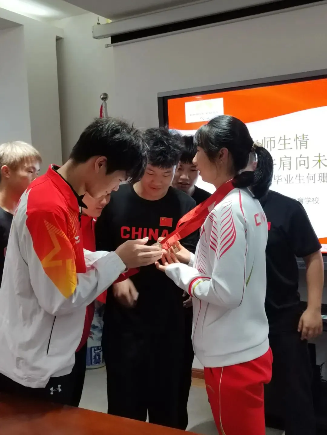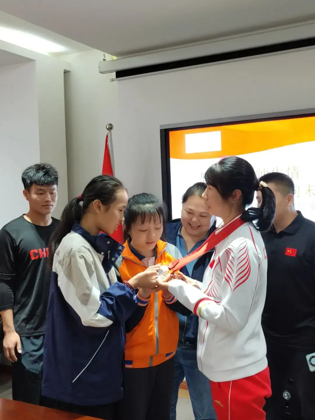 在与师生的互动交流中,盲人跳绳队匡威、足球队袁志松等几名学生代表表达了对何珊珊的崇敬之情,他们纷纷表示要以她为榜样,刻苦训练、追逐梦想,也希望未来能在残奥会上取得摘金夺银的优异成绩。何珊珊还向大家展示了自己夺得巴黎残奥会的银牌和铜牌,同学们纷纷上前抚摸、观赏。最后,活动在拍摄完集体照后圆满结束。