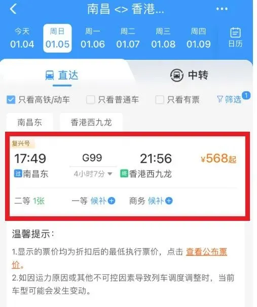 1月5日起,G99次高铁每日13:53从上海虹桥站始发,南昌东站出发时间为17:49,于21:56到达香港西九龙站