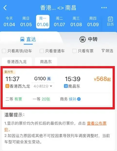 1月5日起,G100次高铁每天11:37从香港西九龙站始发,于15:39到达南昌东站