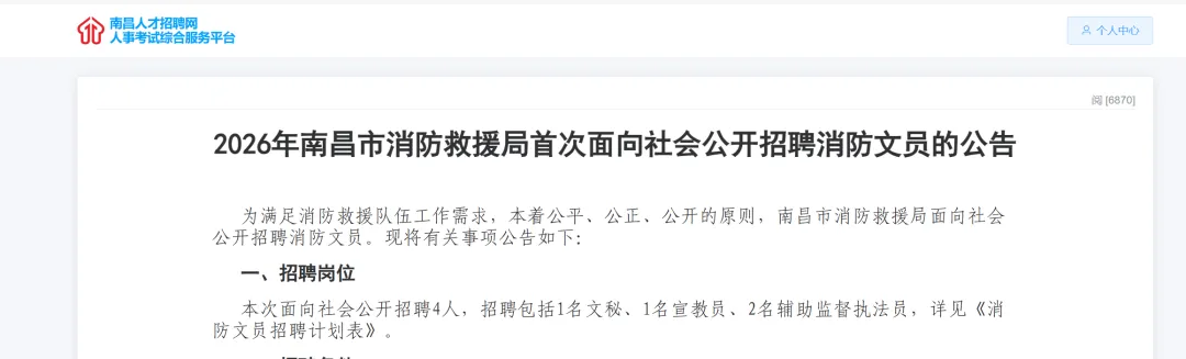 2.报名方式:本次招聘采取网上报名的方式,具体报名方法及岗位信息见南昌市人社局网、南昌人才招聘网(www.ncrczpw.com),招聘对象通过电脑登录南昌人才招聘网,选择“2026年南昌市消防救援局首次面向社会公开招聘消防文员”专题,注册并登录报名系统,据实填写报名信息并上传电子照片等。