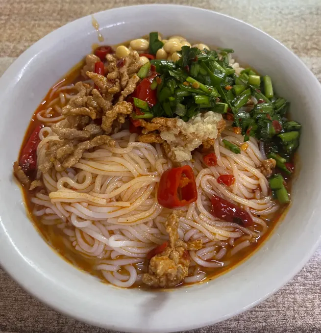【新余腌粉】这粉不是煮着吃的,是“拌”出来的。米粉煮熟后,必须过一道冷水,把热气激掉,粉才劲道。然后是重头戏:蒜末、干辣椒粉、萝卜干、花生米,最后淋上一勺特制的橘皮酱油和滚油。筷子一搅,香气直冲脑门,嗦一口,酸辣鲜香在舌尖炸开,人瞬间就醒了。