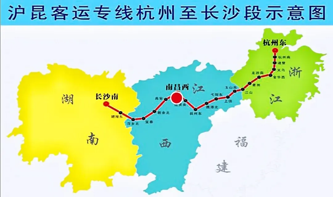 2009年12月份沪昆高铁的杭州至长沙段开工建设,并在2014年12月份建成通车,南昌正式进入高铁时代。而随着沪昆高铁的建成通车,南昌米字形高铁枢纽的两向高铁形成,东可以直达杭州、上海,西能进入长沙、贵阳和昆明等地,南昌接入全国高铁路网。