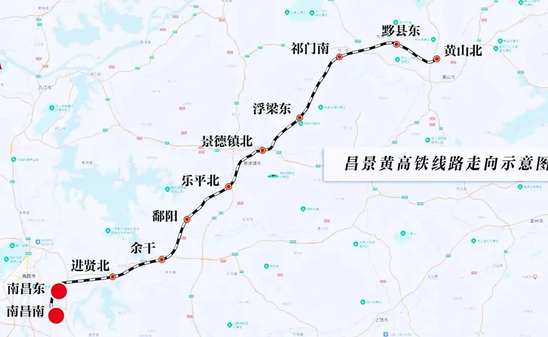 2018年12月,昌景黄高铁开工建设,2023年昌景黄高铁建成通车,南昌又一条北上高铁通道形成。至此,南昌米字形高铁枢纽已经建成了四个方向,工程完成一半。