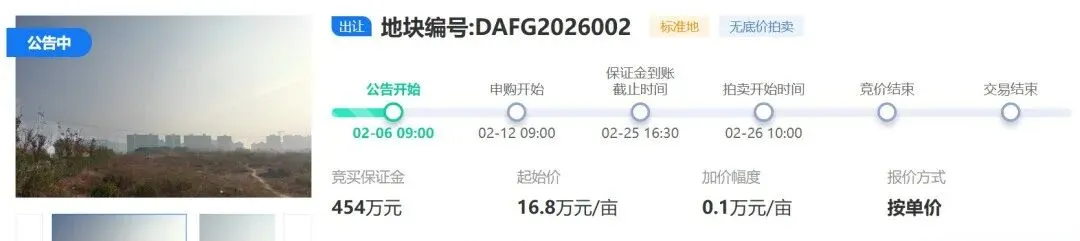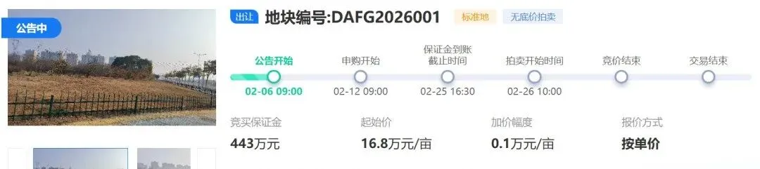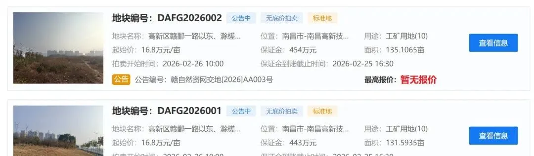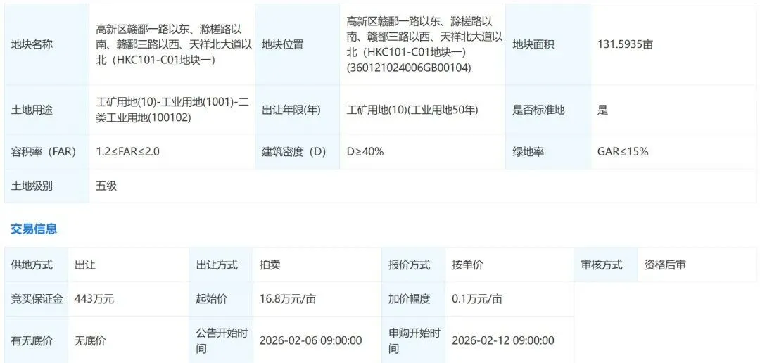 DAFG2026002地块位于高新区赣鄱一路以东、滁槎路以南、赣鄱三路以西、天祥北大道以北,地块面积135.1065亩,土地用途工矿用地,地块容积率2.0,建筑密度40%,绿地率15%,出让起始价16.8万元/亩。