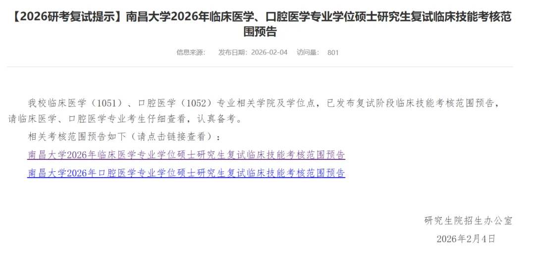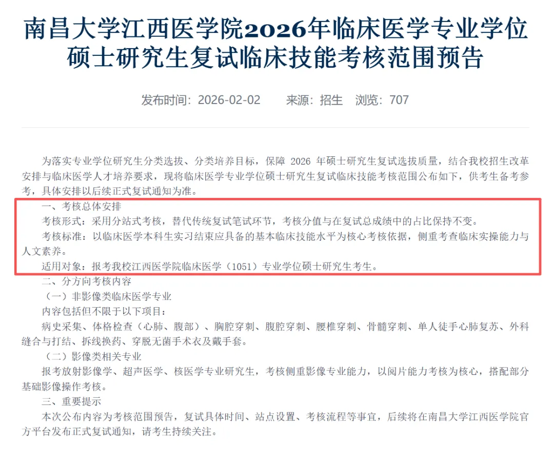 南昌大学公布了《江西医学院2026年临床医学专业学位硕士研究生复试临床技能考核范围预告》,该公告中公布了复试考核的总体安排以及分方向的考核内容。