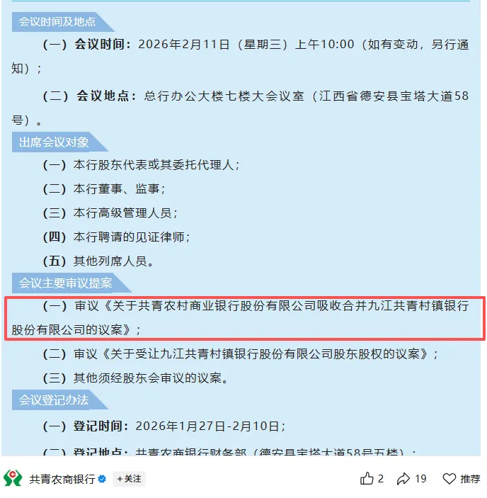 江西共青农商银行将于2月11日召开临时股东会,审议吸收合并九江共青村镇银行的议案。这是南昌农商银行又一家将被本土农商银行吸收合并的村镇银行。南昌农商银行发起设立了7家村镇银行,分别位于上海嘉定、江西省万安县、峡江县、遂川县、永丰县、乐安县和共青城市。除了共青村镇银行外,其他均以“洪都”命名。“豫章故郡 洪都新府”,作为地方农商银行,2012年南昌农商银行放弃了用古称命名的“洪都农商银行”行名,把“洪都”放在了旗下村镇银行身上。2025年,该行脱离了江西农商联合银行的管理,转交地方管理。就在前几日,南昌金控获批成为其股东。不过迄今为止,南昌农商银行的身上看不到“独立”的样子,不管是业务还是品牌,依然是江西农商的模样。去年的12月,乐安洪都村镇银行发布消息,将被乐安农商银行吸收合并,此后万安、峡江、遂川也陆续传出改革的消息。江西早早的完成了农信社改制,全省农信机构全部改为农商银行,并走上了农商联合银行的发展之路。在农商系村镇银行的改革路径上,江西坚定的采取了本地农商吸收合并的方案。截至当前,江西省已完成浮梁农商(景德镇农商银行)、吉水庐陵(吉水农商银行)、九江庐山浔银(九江农商银行)三家农商系村镇银行改革。另有9家农商系村镇银行已在改革之中,待改革机构仅剩3家,清零目标指日可待。-------------------------------------------------------------