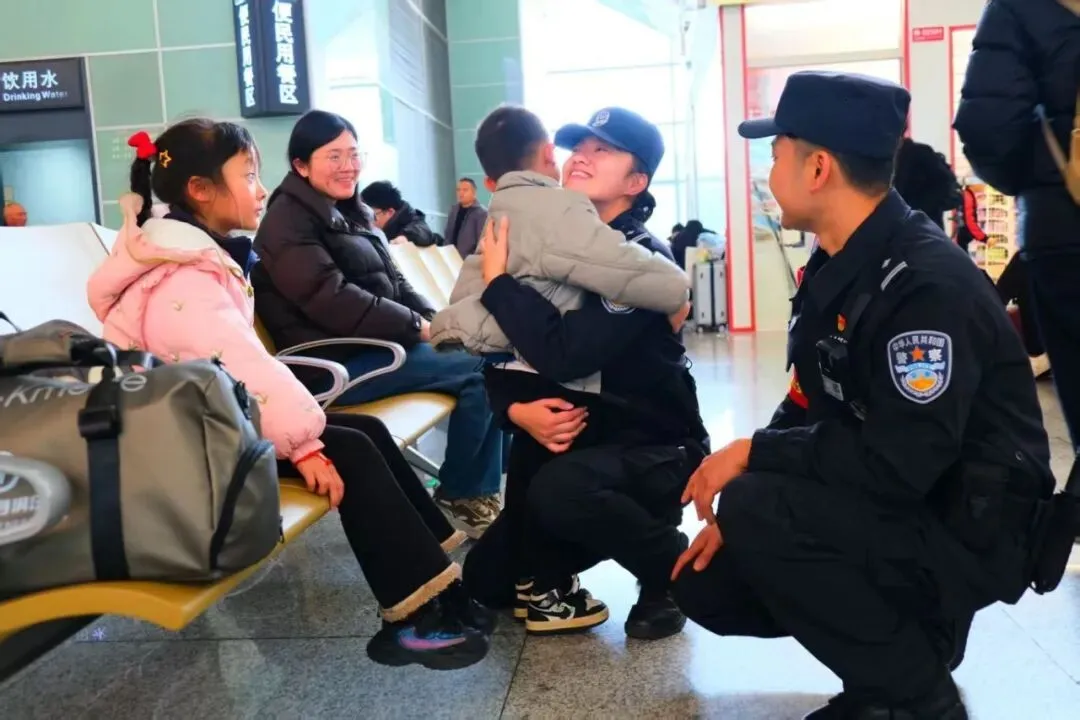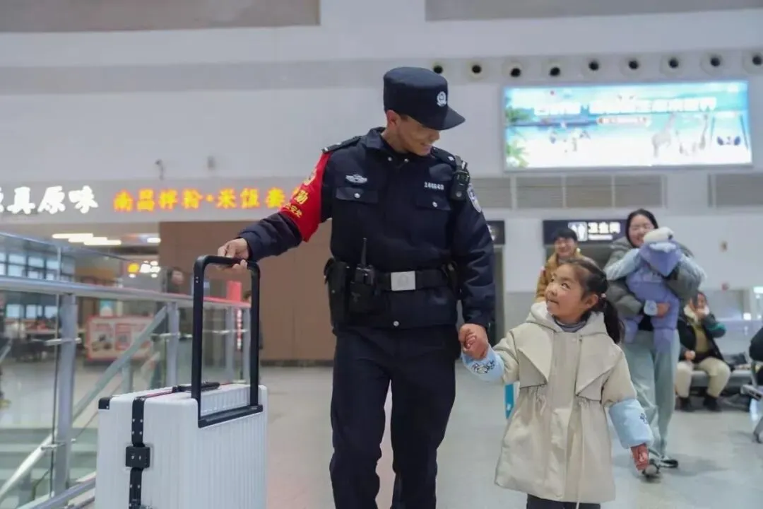 故事:鹰潭北站的候车厅里,藏族民警阿旺郎加一手拉着行李箱,一手牵着小女孩的手,笑意温柔。藏蓝警服与孩童的米白外套相映成趣,雪域温暖与赣地烟火在此刻交融,欢声笑语里,满是温情守护。