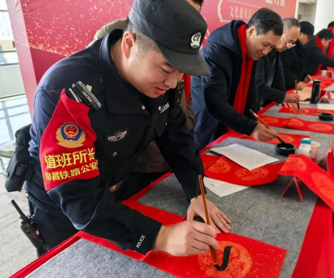 故事:春运期间,南昌西站派出所民警挥毫写春联,墨香与年味交融。笔锋流转间,既有传统文化韵味,更有守护平安的温情祝福。