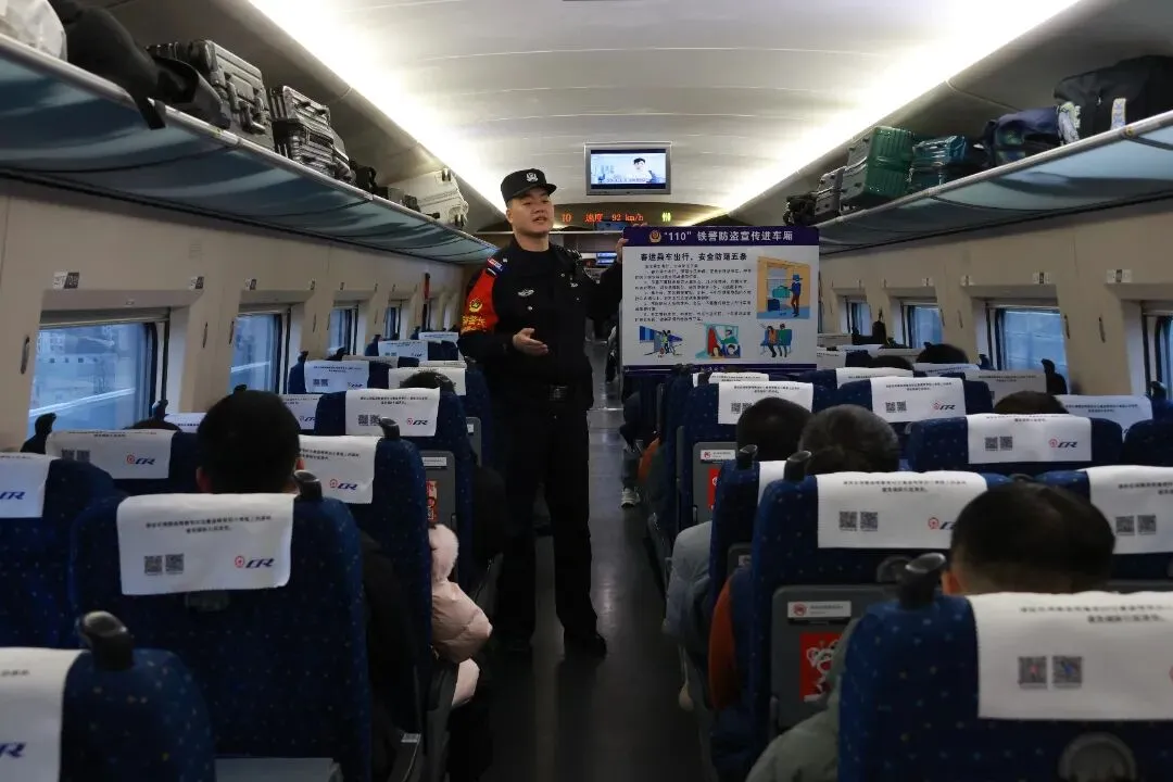 故事:春运期间,乘警在高铁车厢里进行防盗安全宣传,守好旅客群众的钱袋子。