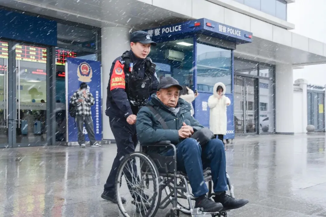 故事:景德镇北站派出所执勤民警张晨龙在巡逻过程中发现,一名腿脚不便的老人因雪天地滑正愁于出站,民警见状立即推来轮椅将其送出站外乘车。