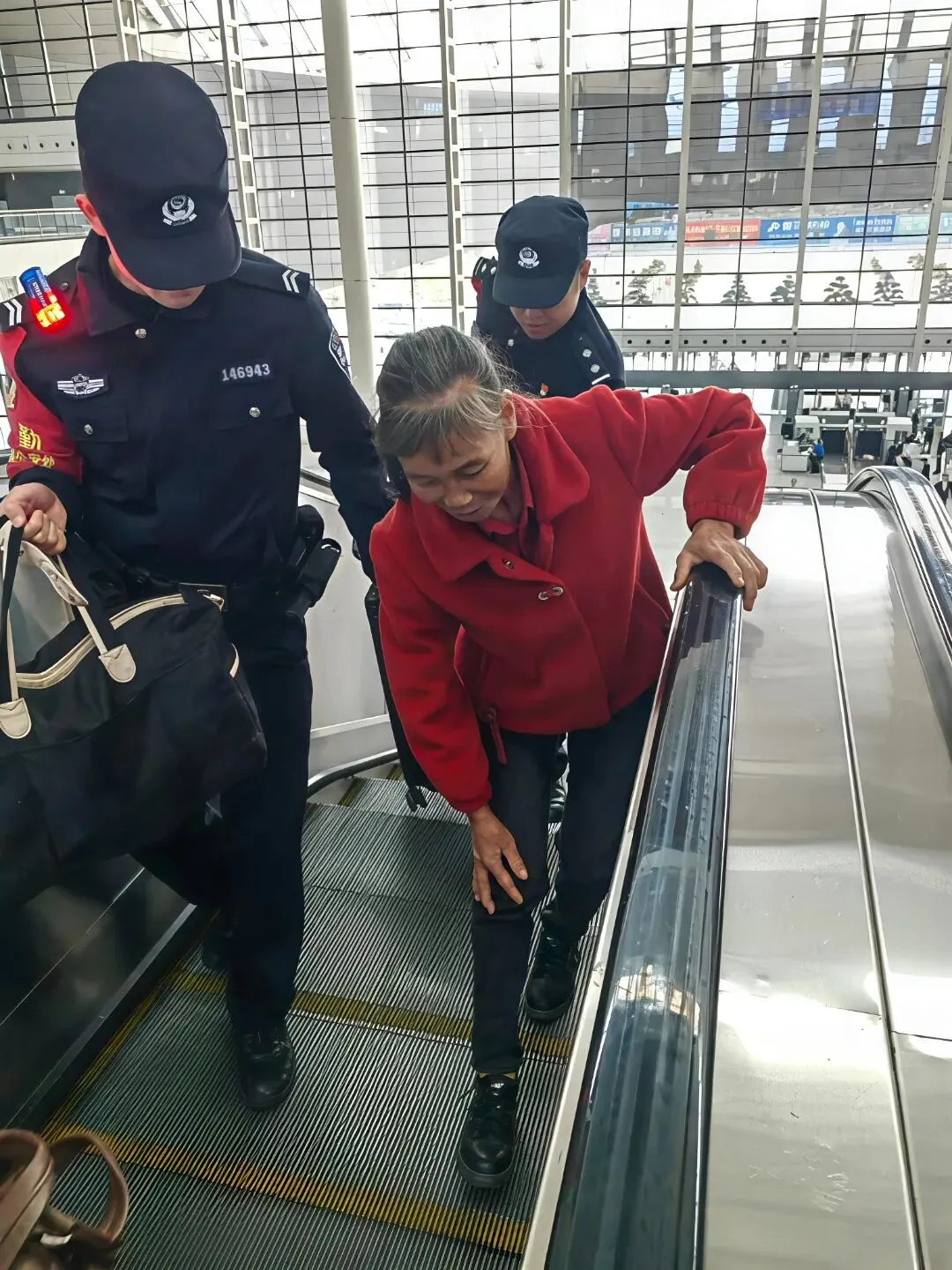 故事:2月2日,一名旅客在扶梯上摔倒,执勤民警火速按下急停键,并护送其到候车厅休息。