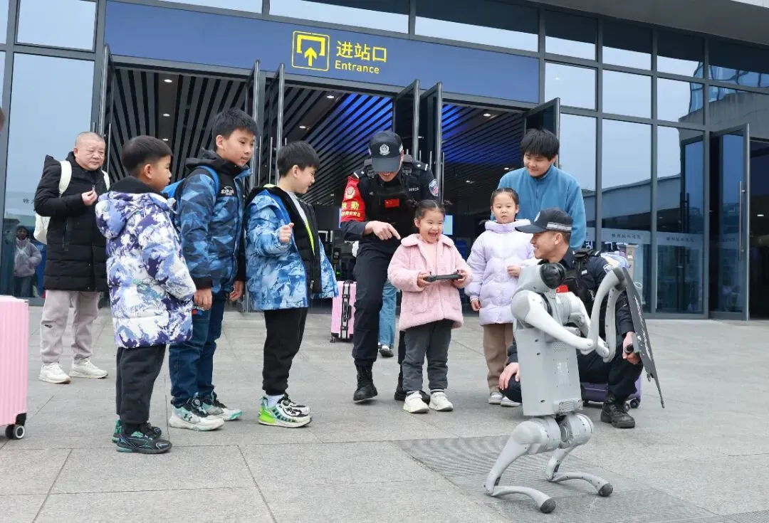 故事:在赣州站进站口,赣州铁路公安处特警携警用巡逻机器狗与候车的孩子们趣味互动,萌态十足的机器人牢牢吸引了孩子们的好奇目光。
