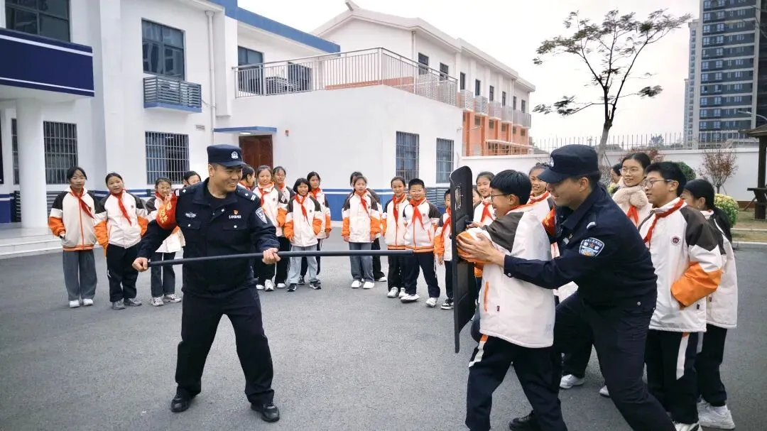 故事:泉州南站派出所大院内,一场别开生面的安全实训正在进行。民警手把手指导学生使用盾牌和钢叉,亲身体验防护器械的操作技巧,为校园安全增添一份生动保障。