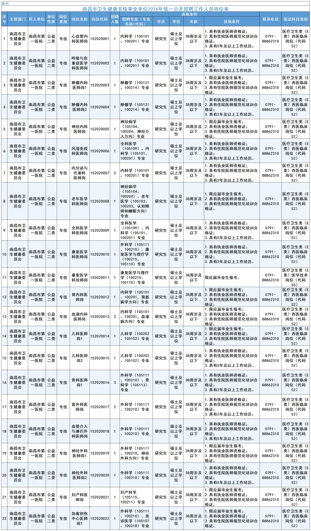 南昌市第一医院(南昌大学第三附属医院),招聘52人