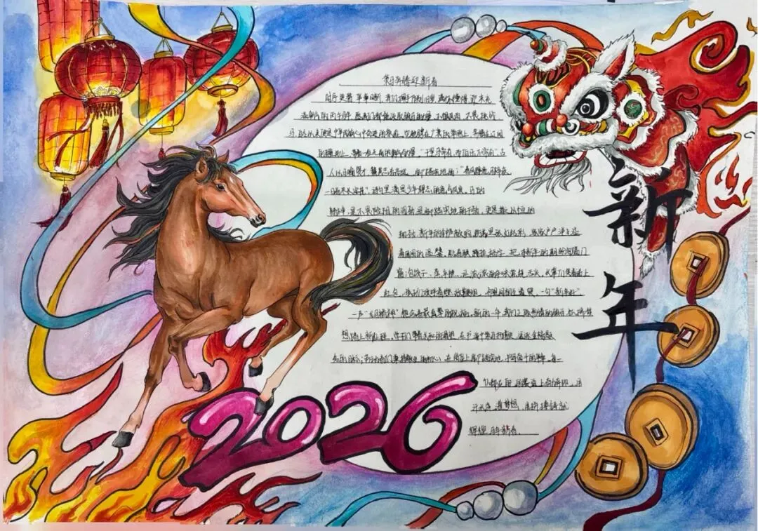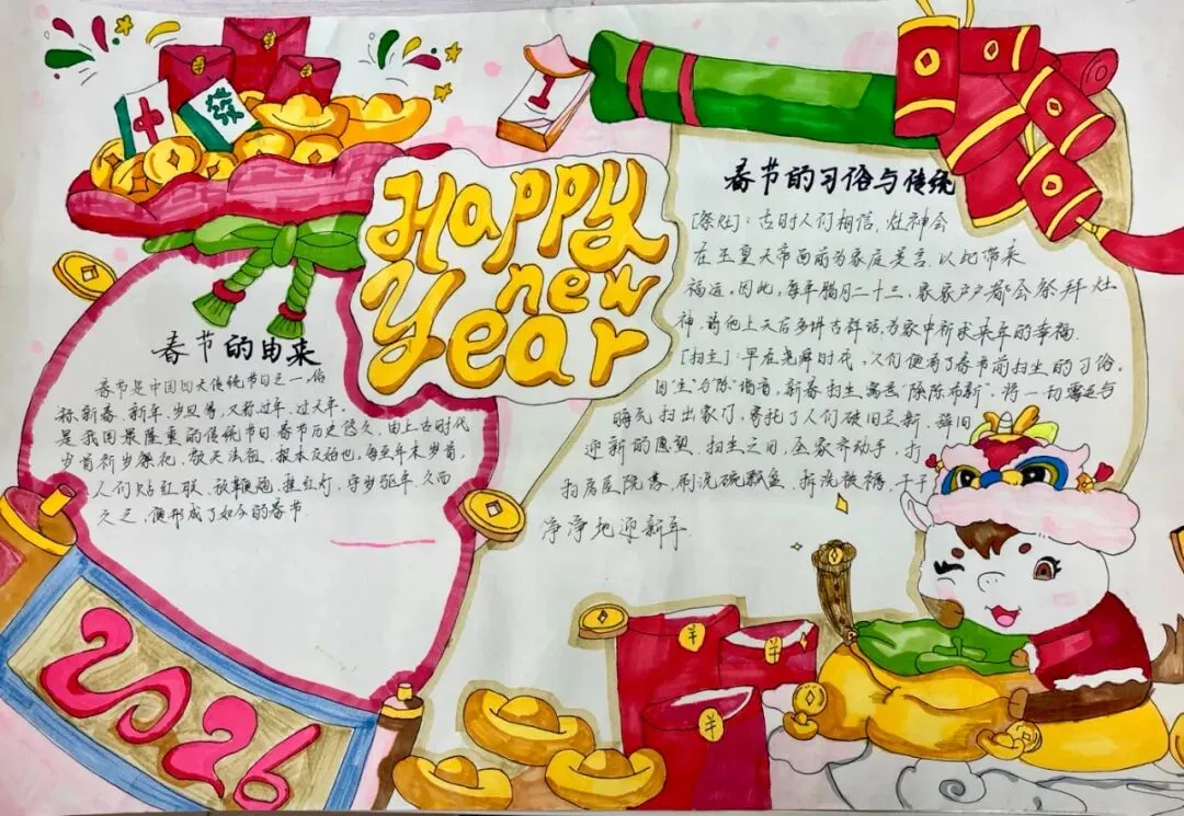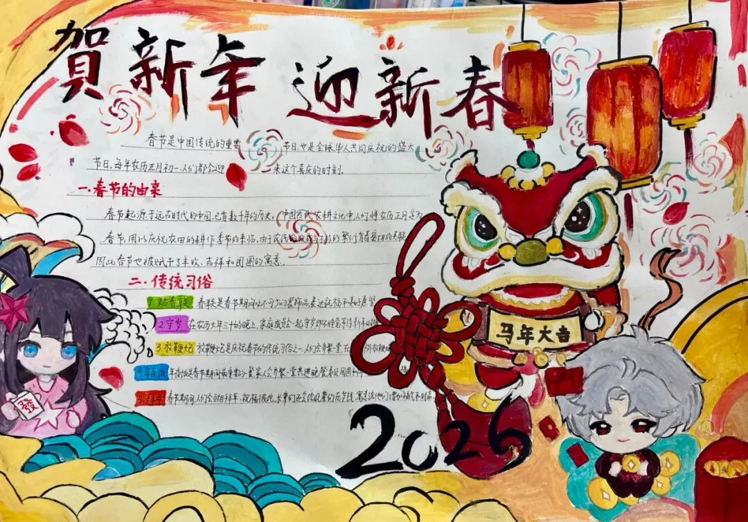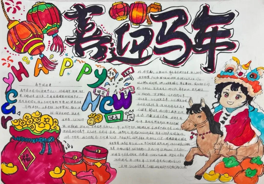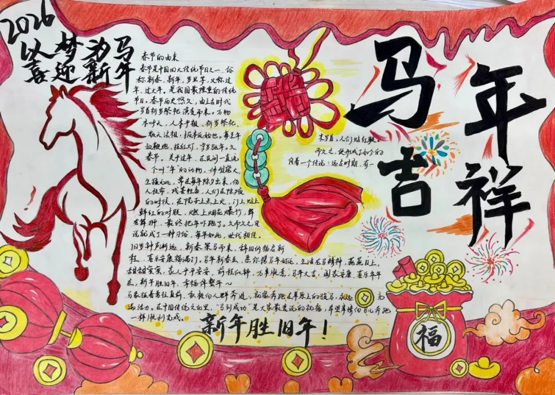 为弘扬中华优秀传统文化,增强学生对民族节日的认同感,学校特举办“骏马迎春·祥瑞新年”手抄报创作活动,全校各班级学生围绕2026年农历马年春节,以图文并茂的形式绘制春节习俗、家风故事、新年愿景、传统文化等内容。此次手抄报创作活动共评选出18份优秀手抄报作品,展示如下: