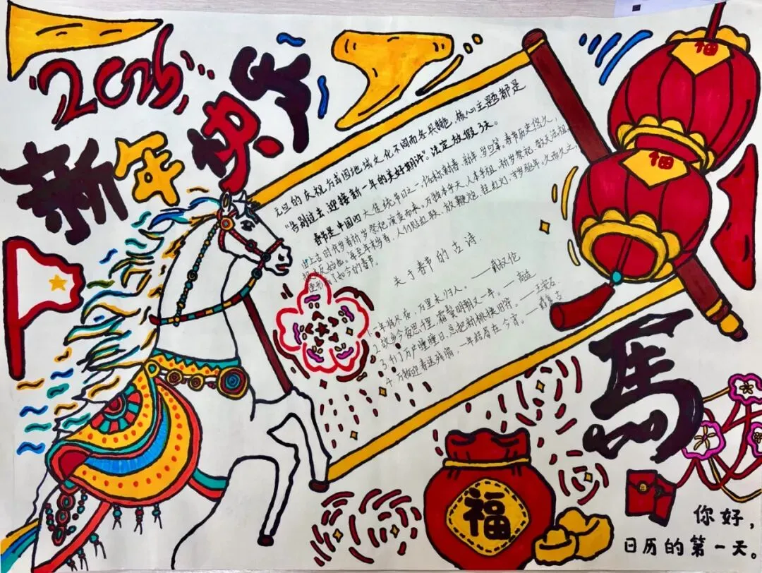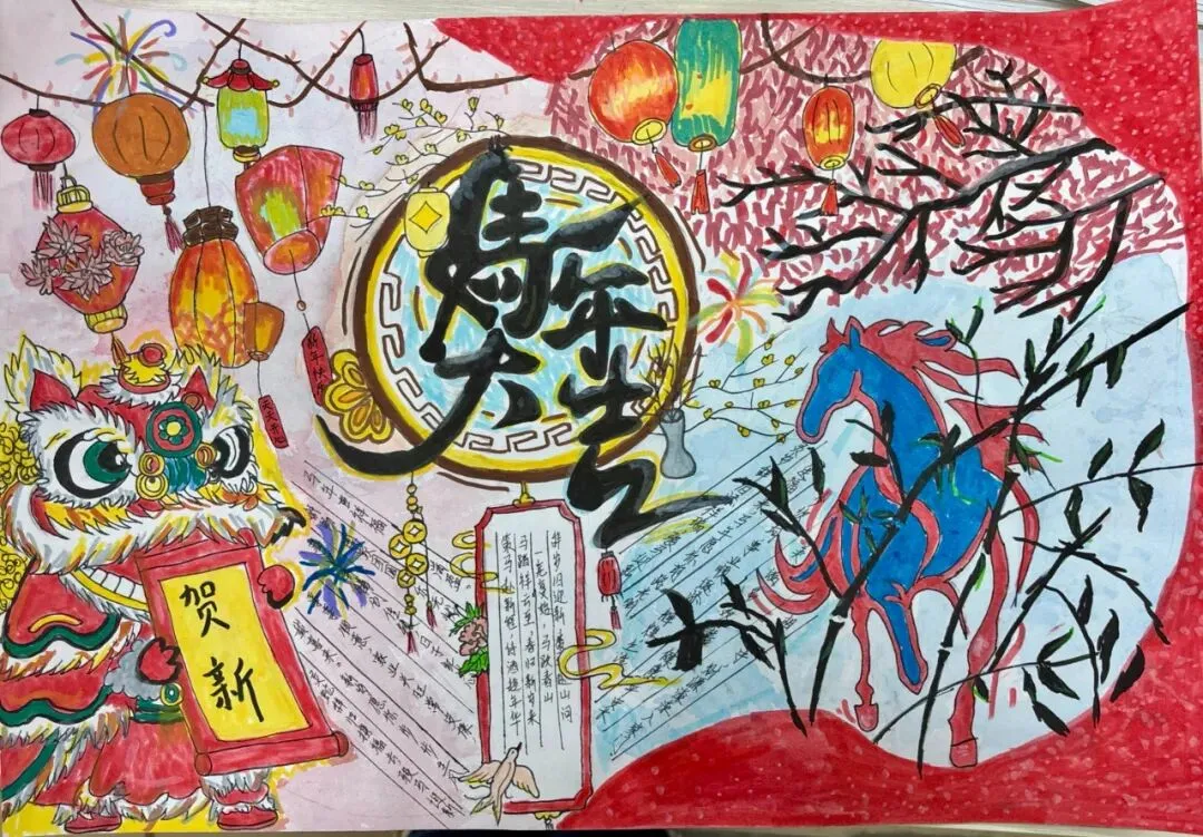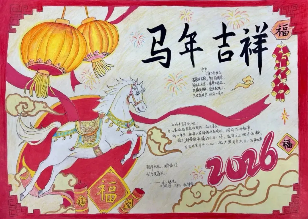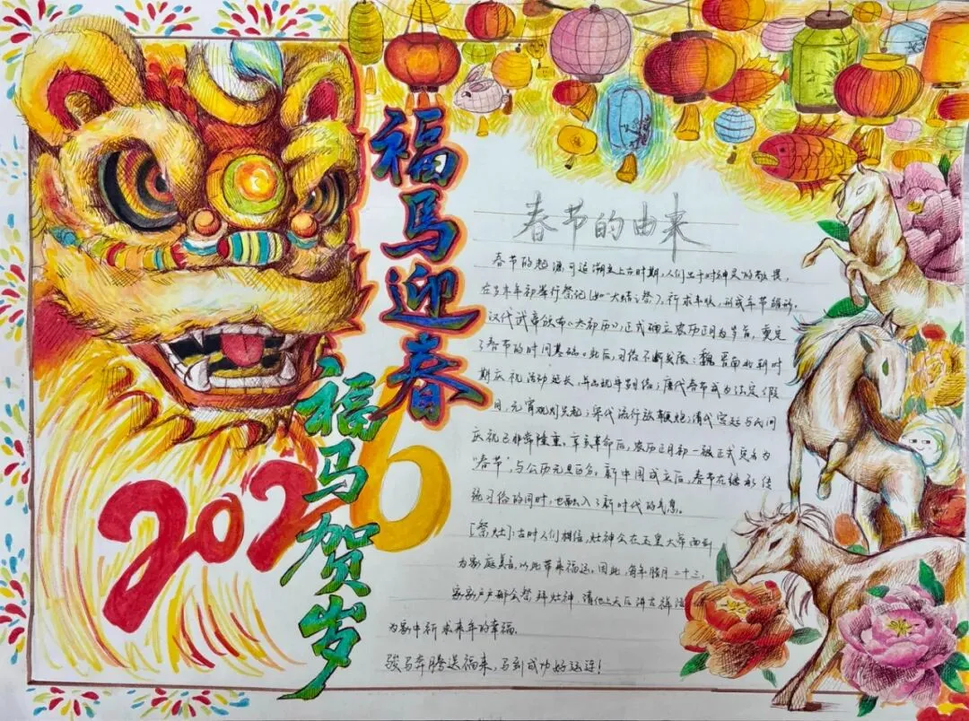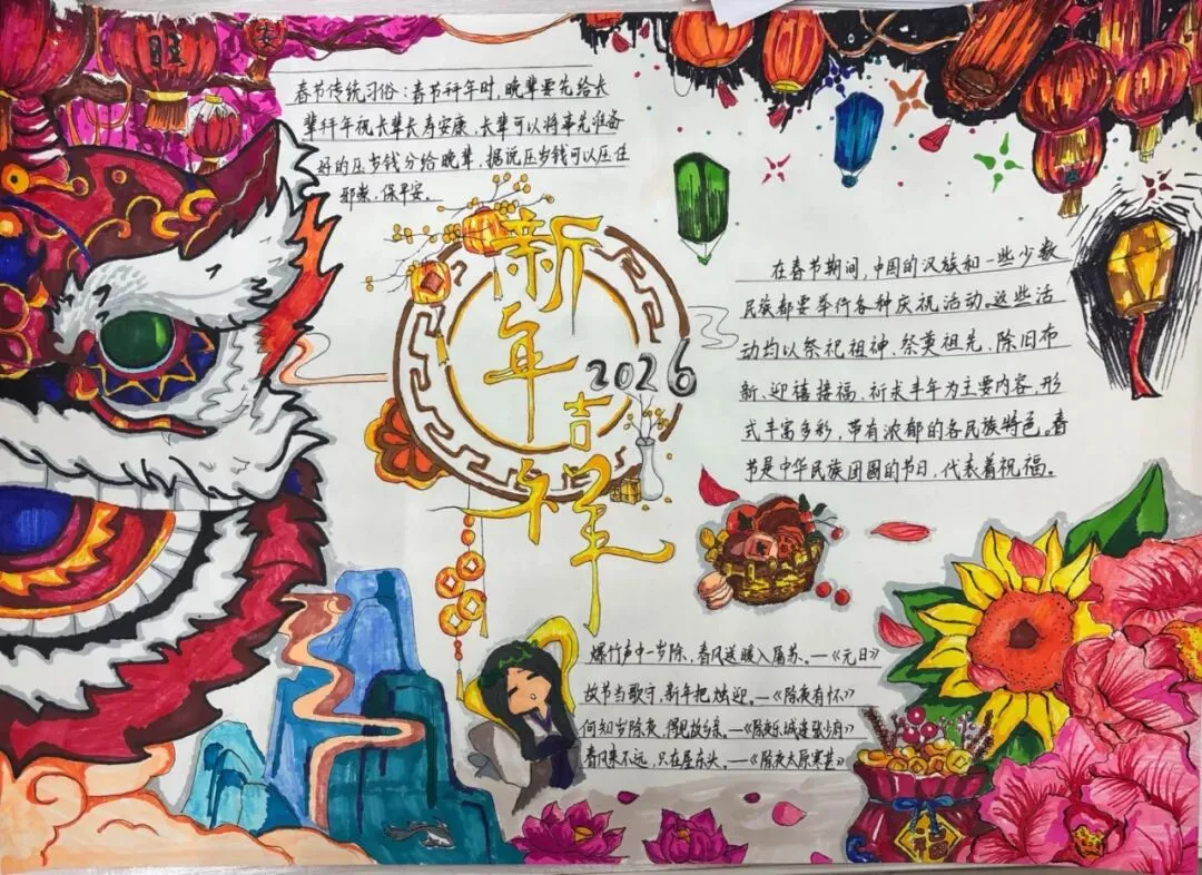 为弘扬中华优秀传统文化,增强学生对民族节日的认同感,学校特举办“骏马迎春·祥瑞新年”手抄报创作活动,全校各班级学生围绕2026年农历马年春节,以图文并茂的形式绘制春节习俗、家风故事、新年愿景、传统文化等内容。此次手抄报创作活动共评选出18份优秀手抄报作品,展示如下: