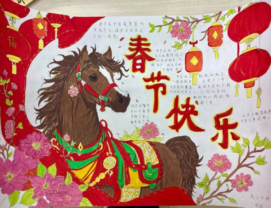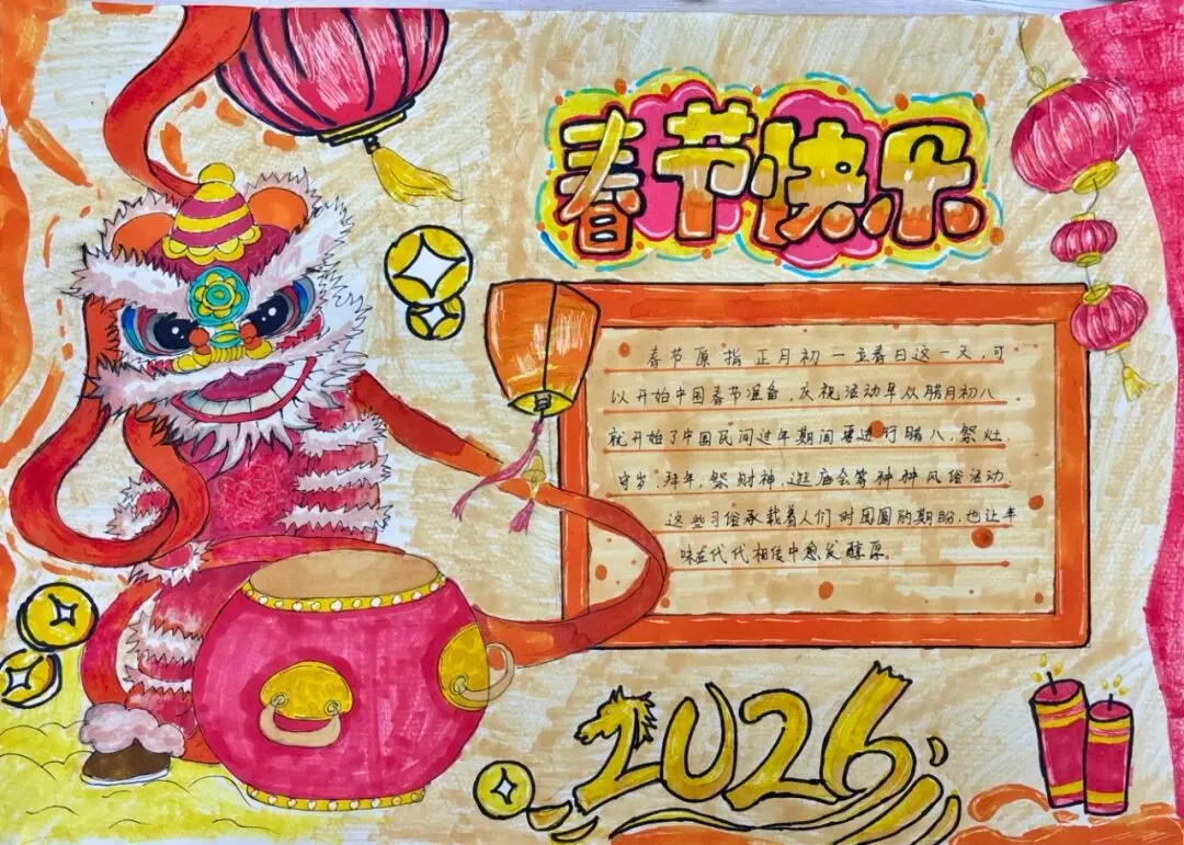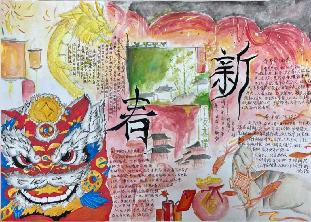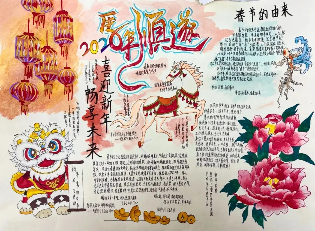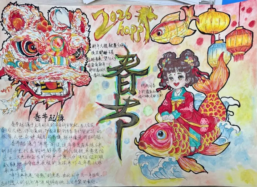 为弘扬中华优秀传统文化,增强学生对民族节日的认同感,学校特举办“骏马迎春·祥瑞新年”手抄报创作活动,全校各班级学生围绕2026年农历马年春节,以图文并茂的形式绘制春节习俗、家风故事、新年愿景、传统文化等内容。此次手抄报创作活动共评选出18份优秀手抄报作品,展示如下: