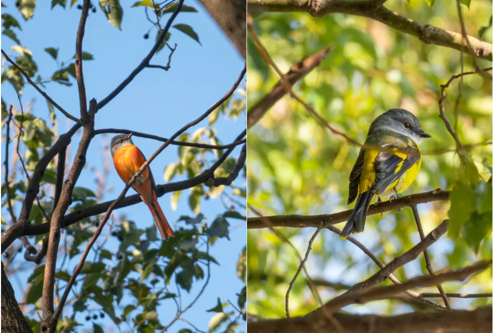 最先吸引我们的是两只灰喉山椒鸟。它们站在高枝上,雄鸟背部黑红相间,喉部浅灰,在阳光下很是醒目;雌鸟则以黄色为主,同样俏丽。它们不太怕人,让我们看了好一会儿。