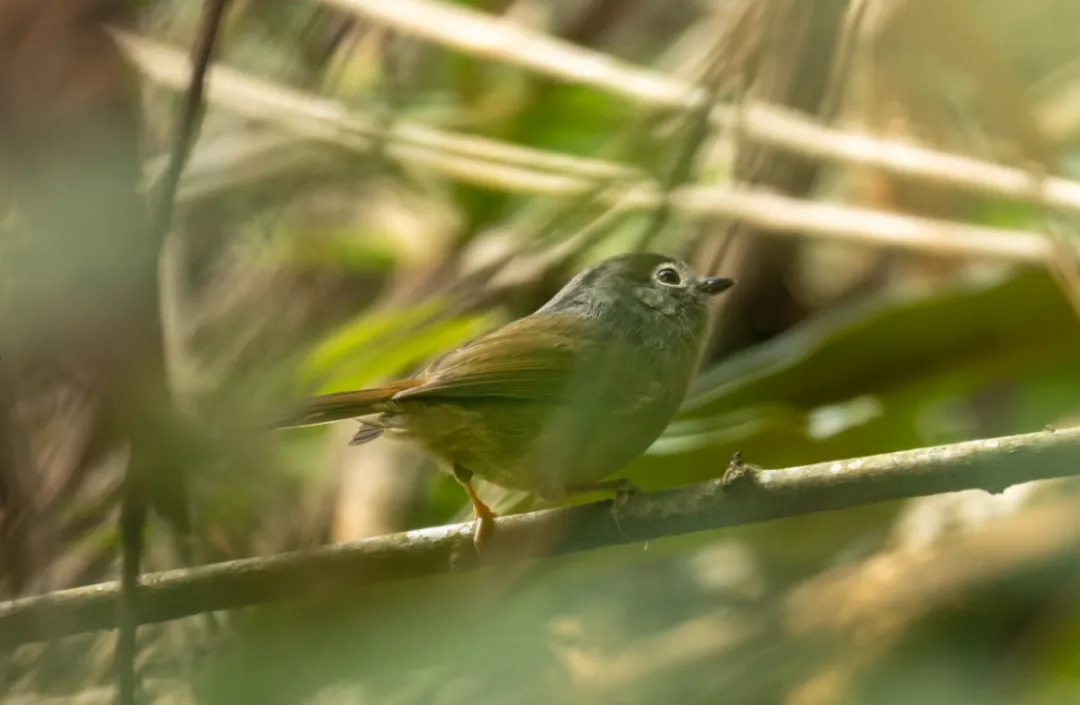 临近傍晚(约16:50),在伶音亭旁的茂密灌丛下,传来了细碎的声响。我们屏息观察,看到了红头穗鹛和淡眉雀鹛在其中结群觅食。红头穗鹛如其名,头顶带着棕红色,在昏暗的林下环境中需要仔细辨认。