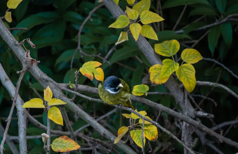 首日回程,路径东门附近的盘旋步道时,又遇上一小群红头长尾山雀和大山雀。更令人惊喜的是,两只领雀嘴鹎稳稳地站在显眼的枝头。它们最特别的是那张象牙白色的、厚厚的嘴,以及胸前一道白色的半环形“领子”,模样很是独特。