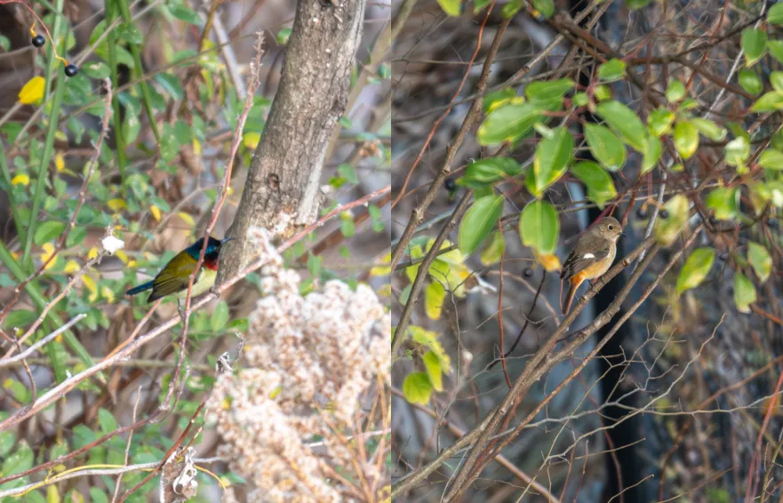 ▲叉尾太阳鸟(雄)和北红尾鸲(雌)