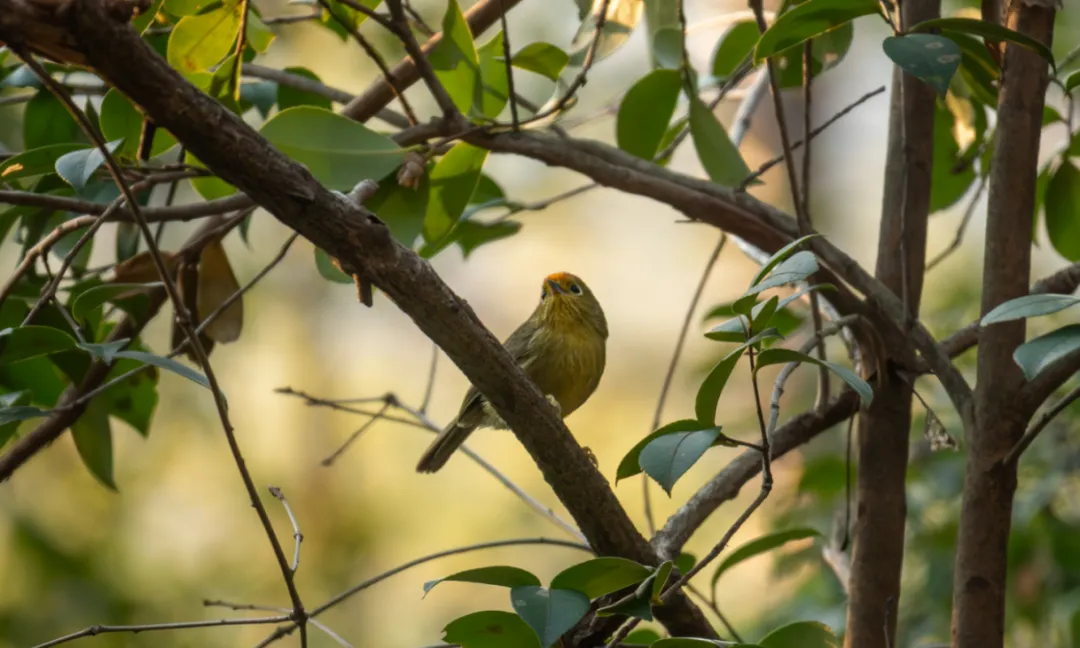 上山步道行不久,便抵达一处被茂密女贞树丛环绕的转角。这里是本次观鸟的“黄金点位”,我们在此驻足约15分钟,目睹了一场小型的“鸟浪”(混合鸟群)。
