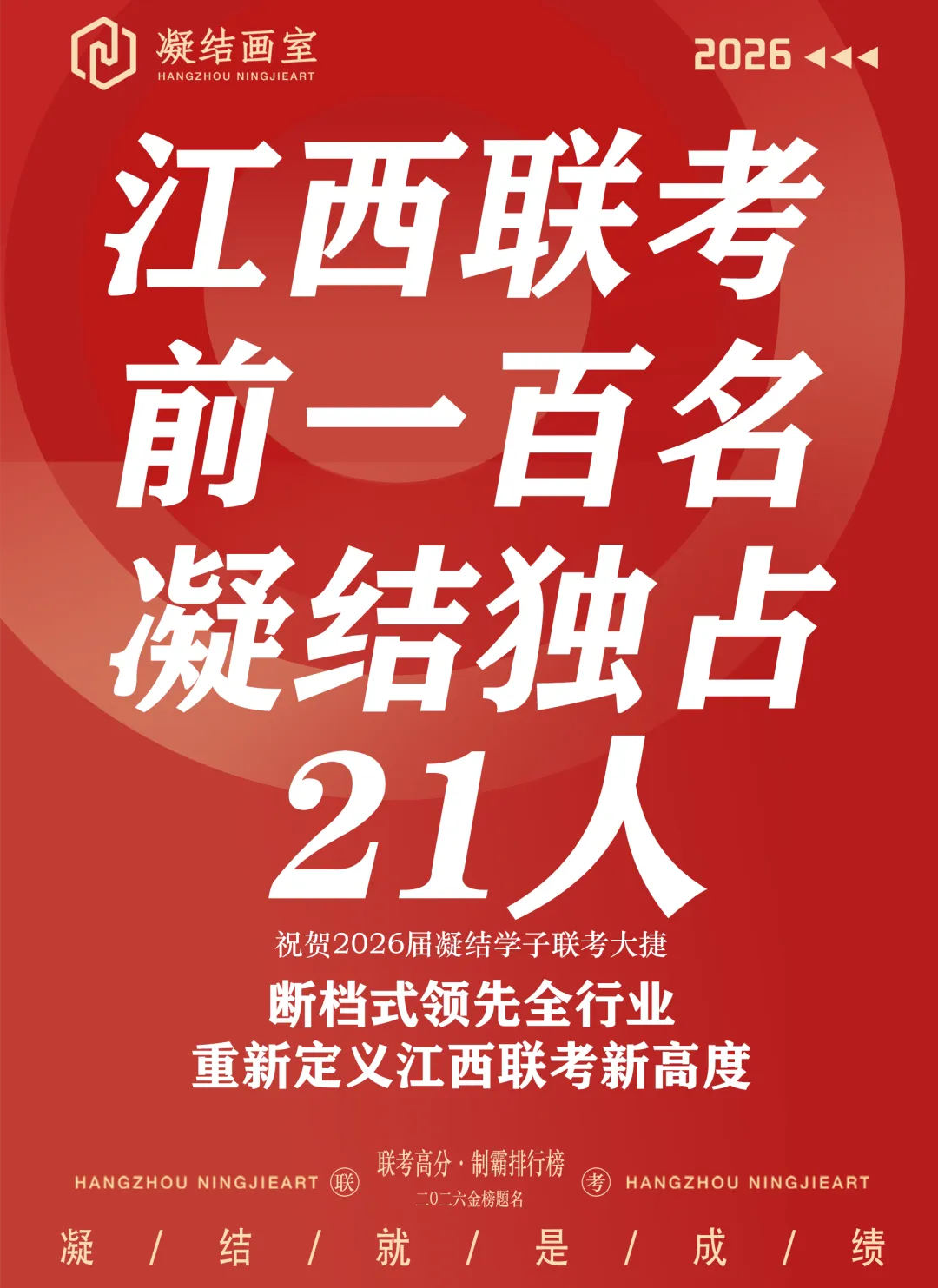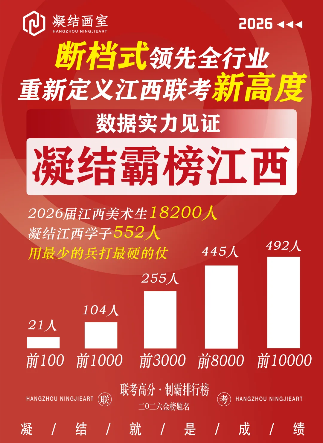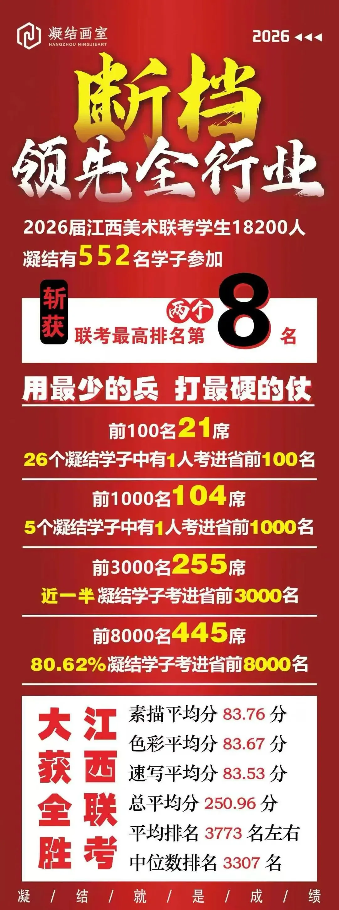 江西艺考圈“拒绝拼成绩”的号角是我们凝结最先吹响、最早呼吁的,我们也绝对不可能有拼成绩、假成绩。会使用杭州凝结的成绩做宣传主要有两个原因:一、南昌凝结去年没有学生,所以先用杭州凝结的数据,但是我们会标注清楚这是杭州校区的成绩;二、杭州和南昌的教学体系一致,并且我们也将部分杭州凝结的骨干派到南昌施教,所以杭州的数据也具备一定的参考性。请各位学生和家长记住,凝结永远不会拼成绩!