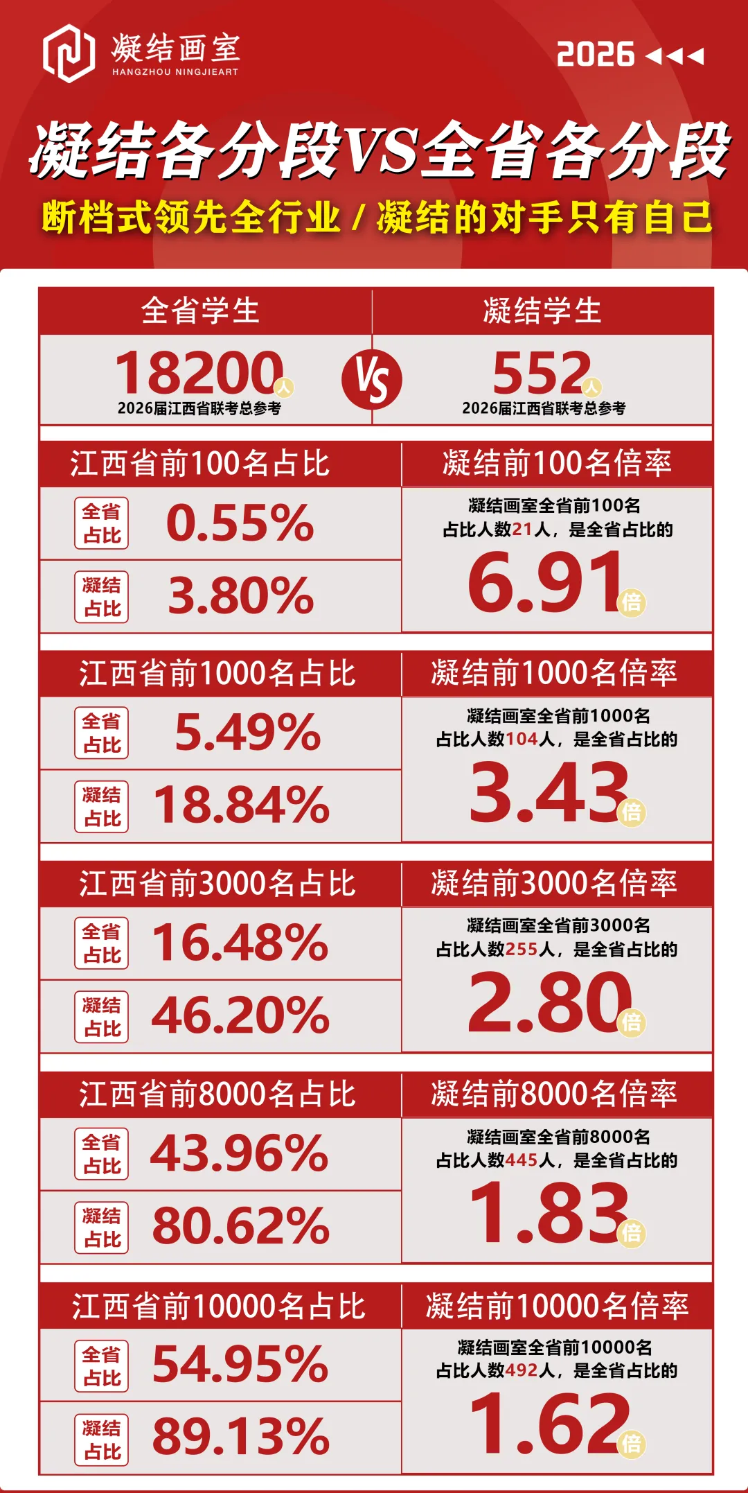 这又是一个经典成绩误区。大家在看成绩时不能只关注具体的人数,而要去看各分段人数在画室总人数的占比。凝结头部厉害在不管是具体人数还是人数占比都是断档式领先全行业,而凝结的整体成绩,因为画室总人数不算多,所以比具体人数的话不占优势,但如果看占比这个更具有说服力的数字,杭州凝结画室去年近一半学生考进前3000名,超80%学生考进前8000名,没有画室比我们的占比更夸张!说凝结整体一般是偷换概念!