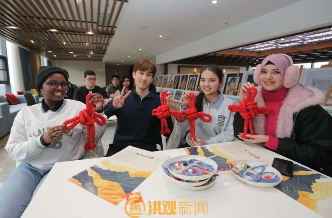 “绳子像这样绕过去,再从这里穿出来……对,慢慢拉紧。”另一边,体验中国结编织的留学生则围坐在长桌旁,对着手中的红绳细细琢磨。“把一根简单的绳子变成这么漂亮的结,感觉太神奇了!”来自土库曼斯坦的杰辉表示。