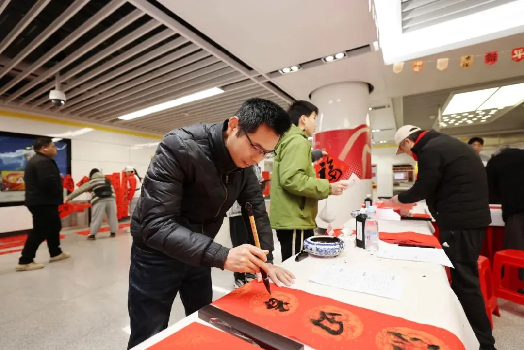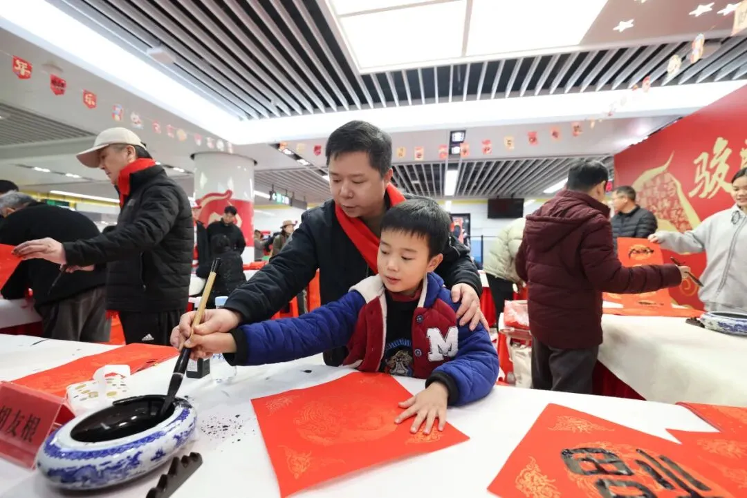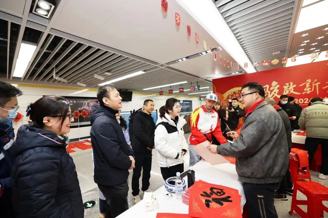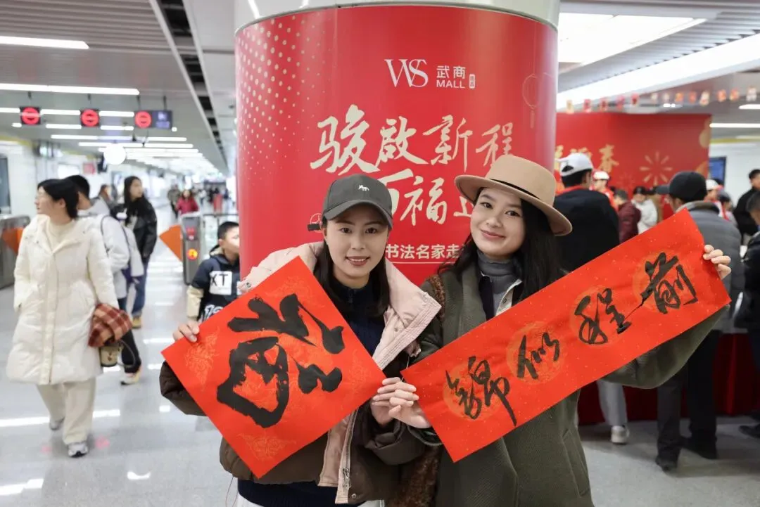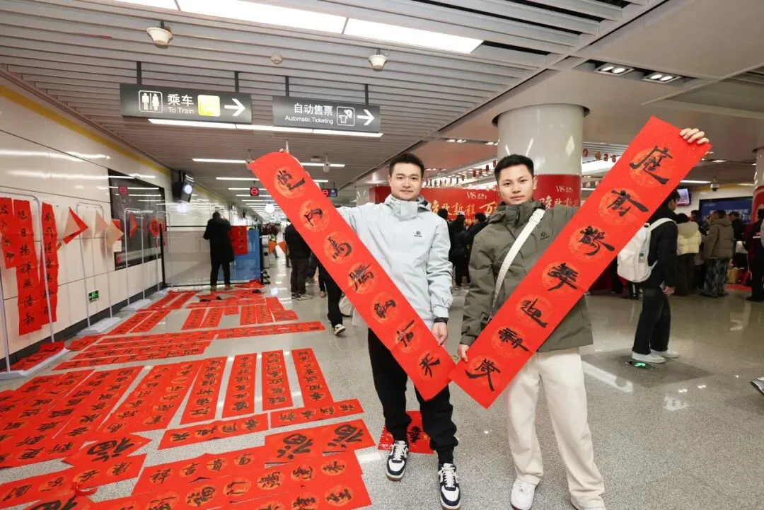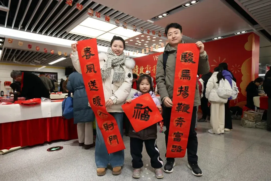 创意纷呈的“花式福字”尤其受到青睐,迅速成为众人拍照打卡的焦点。乘客们手捧春联,有的互相品评笔法意境;有的呼朋唤友来现场体验活动;也有即将归乡的游子,笑着说要将这份祝福带回家乡。南昌武商MALL派送的精美福袋与礼品更添节日喜庆,站厅内笑语洋溢,新春团圆的暖意已悄然漫开。
