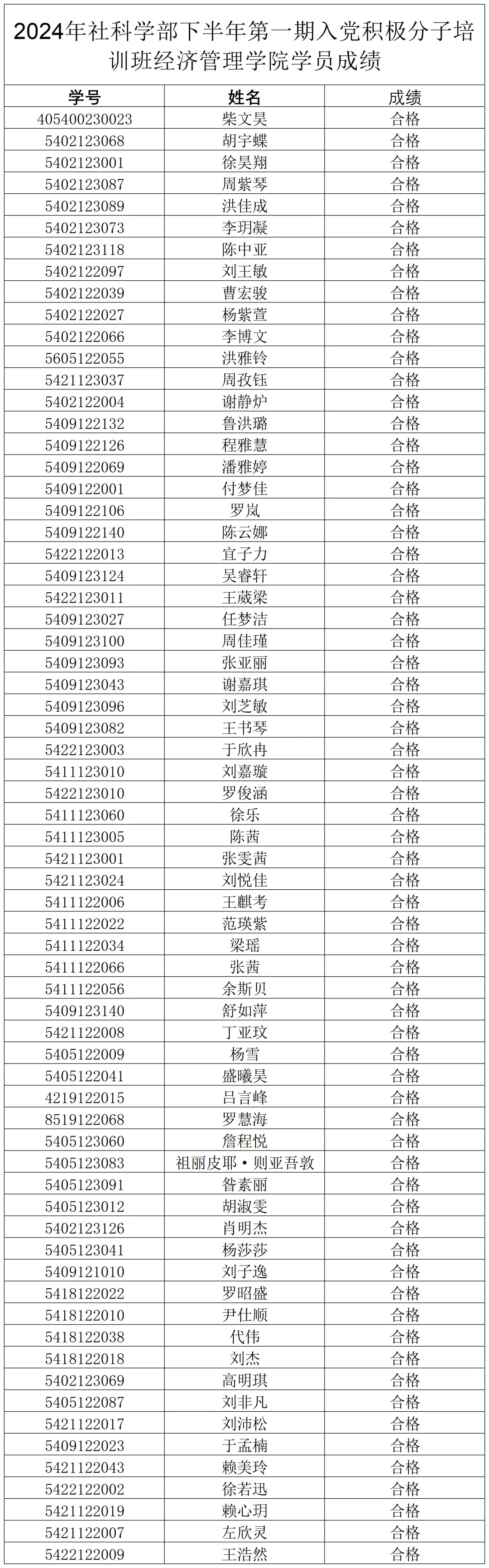 南昌大学社科学部2024年下半年第一期入党积极分子培训班经济管理学院学员培训已结束,经过试卷批阅,成绩复核,现对经济管理学院参加培训的各学员培训通过情况进行公示: