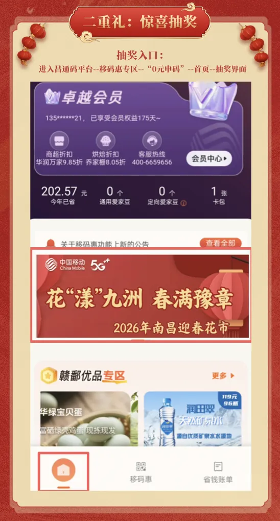 抽奖入口:用户通过昌通码平台扫一扫或首页点击活动图片进入--“移码惠”“0元申码”--首页--中国移动抽奖界面