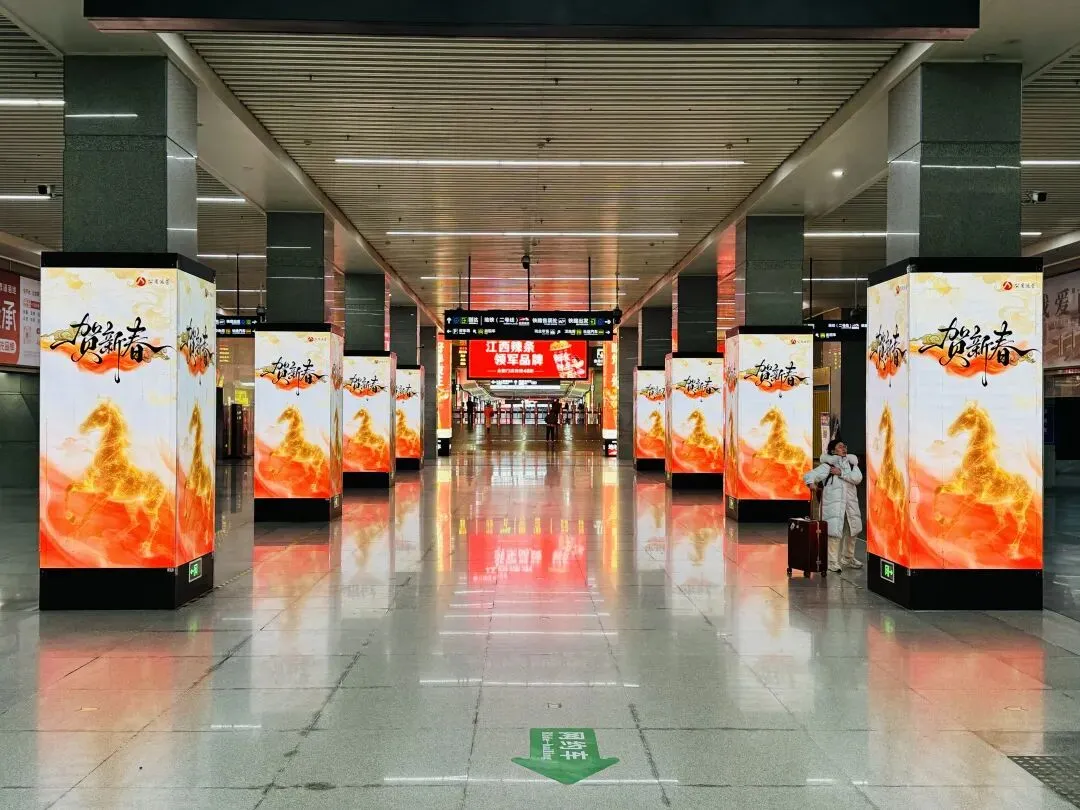 新春脚步渐近,年味悄然浓起。连日来,南昌火车站东广场紧锣密鼓地换上新装,通过悬挂大红灯笼、灯影展示、卫生清洁等多种形式,扮靓东广场大厅景观,营造节日氛围,以焕然一新的面貌迎接八方旅客的到来。走进站内换乘大厅,节日的氛围浓郁十足。一盏盏大红灯笼高高挂起,流苏随风轻摆,与LED灯带交相辉映。工作人员站在梯子上,仔细调整着每一盏灯笼的位置,确保它们既能烘托节日气氛,又不影响旅客通行。大厅内,LED广告屏也全部换上了“贺新春”的主题画面,金色的骏马图案寓意着“一马当先迎新岁”,传递着对新年的美好祝愿。