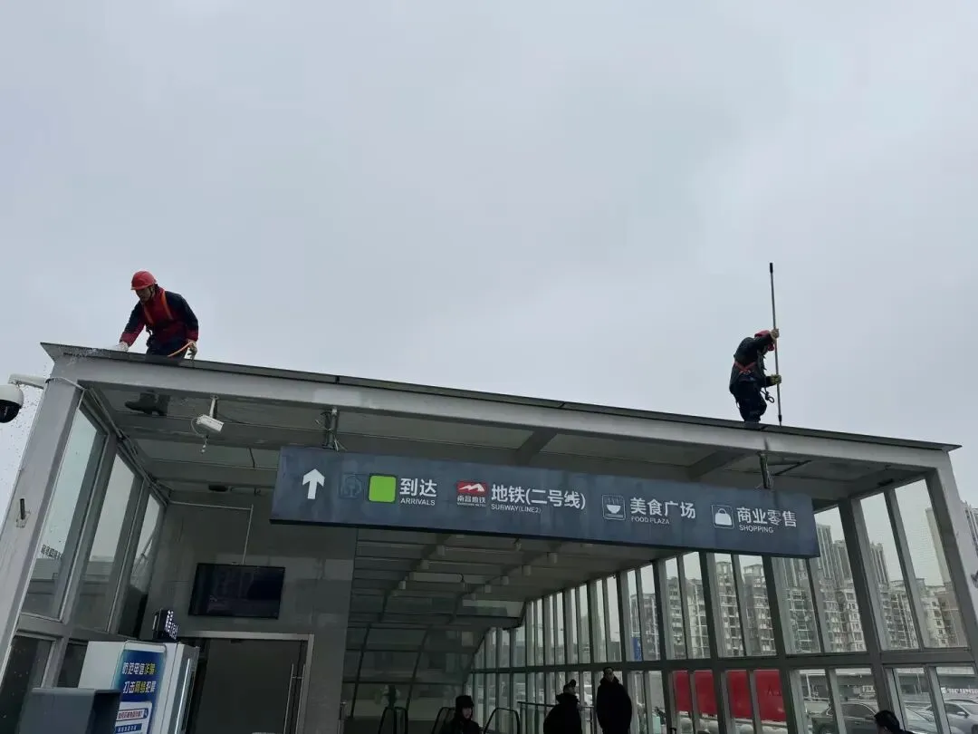 除了内部装饰,东广场外部建筑的清洁维护也毫不含糊。高空作业人员系着安全绳,站在穹顶边缘,一丝不苟地擦拭着玻璃顶棚。他们手持长杆工具,清理着积尘与污渍,让整个建筑外观在冬日里焕发出明亮的光彩。此次节前布置与清洁工作覆盖了东广场的各个角落,旨在以崭新的面貌迎接归家的游子。随着春运客流量的逐渐增加,南昌火车站东广场已准备就绪,静候八方旅客的到来。
