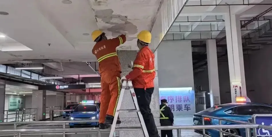 在出租车通道上客区,工程人员架起伸缩梯,小心翼翼地将一个个红色中国结悬挂在立柱顶端。这些中国结在灰色水泥立柱的映衬下显得格外醒目,为原本单调的候车区注入了浓浓的年味。与此同时,另一组工作人员则对墙面进行了深度清洁,他们仔细刮除墙顶的污渍与残留物,确保墙面光洁如新,让旅客在候车时能感受到整洁与舒适。