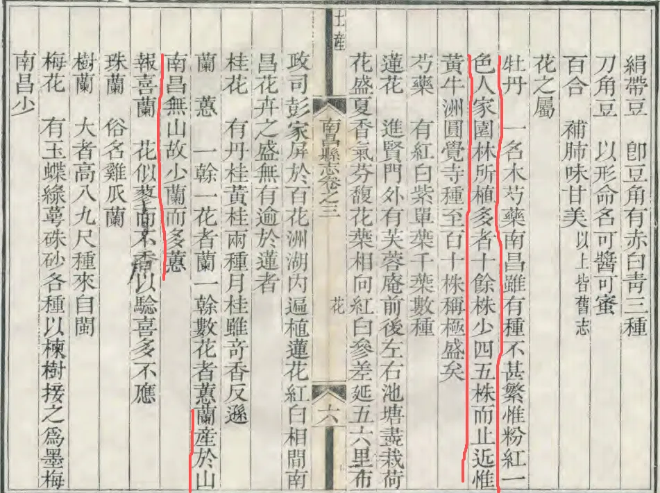 《南昌县志》还专门记载了南昌本地及流通的花卉品种,“牡丹一名木芍药,南昌虽有,种不甚繁,惟粉红一色”,“兰产于山,南昌无山,故少兰而多蕙”,“茉莉、素馨似茉莉而香次之”,“杜鹃即映山红,亦名踯躅花”,等等,明确列出了花市中常见的核心品类,印证了花卉贸易的针对性。
