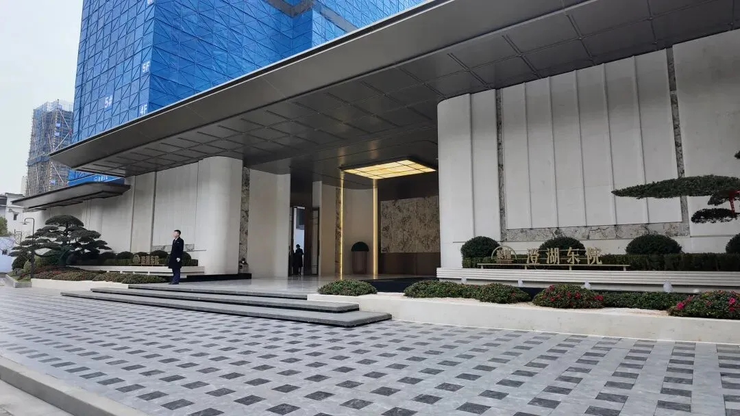 大门采用进口贝金米黄大理石搭配暗香槟金铝板,打造了极具质感的酒店式归家大门,宽 65 米、高 6.2 米,审美和材料都非常高级。