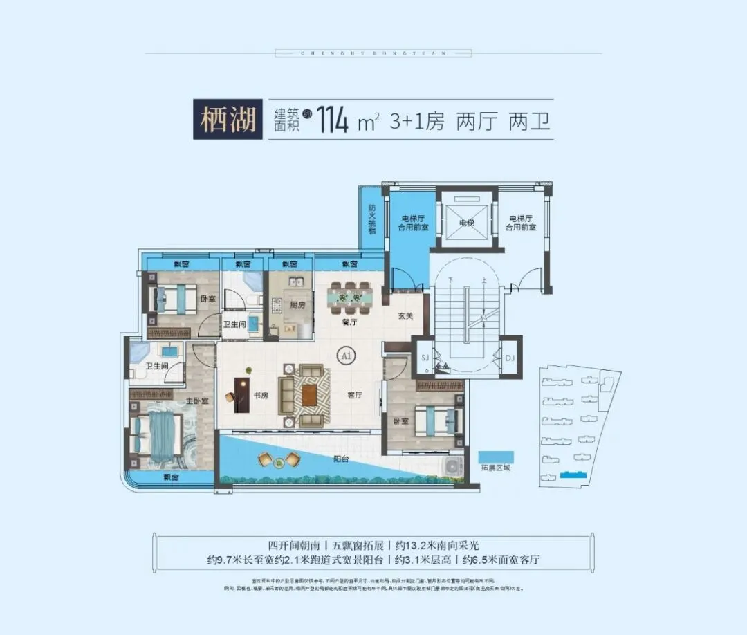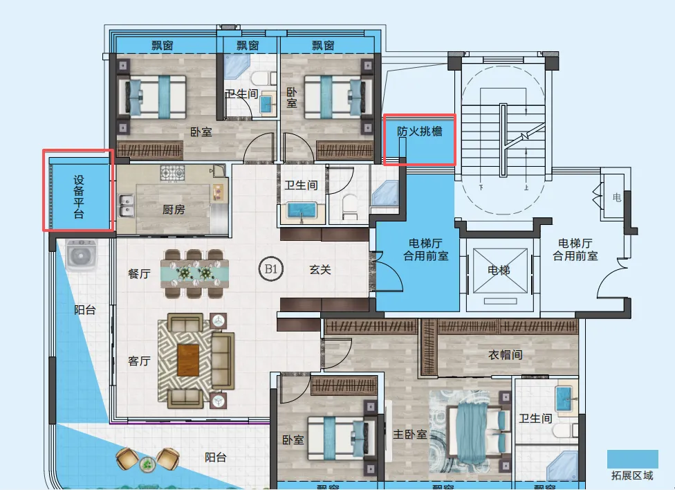 全部都是新规设计,飘窗可拓展,还有防火挑檐可拓展。全部都是独立电梯厅,拥有私密性。
