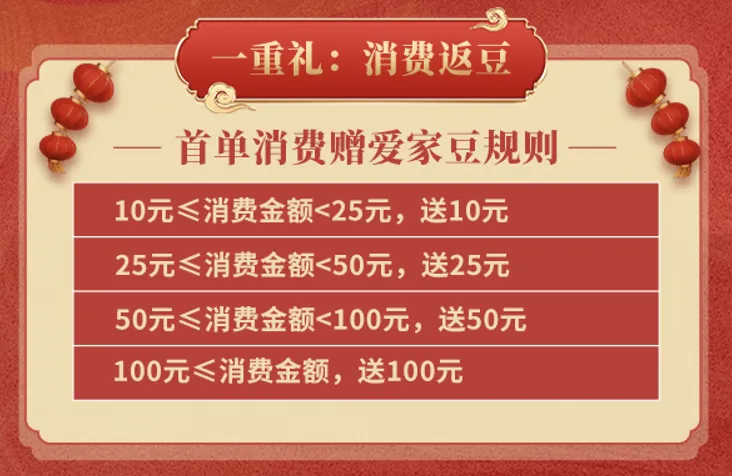 活动规则:用户在活动期间在活动商户现场消费即可参与,以用户单笔消费订单金额为准,活动期间用户只能享受一次优惠,发放爱家豆当日有效(失效时间:发放当日24:00)。