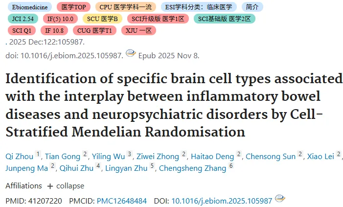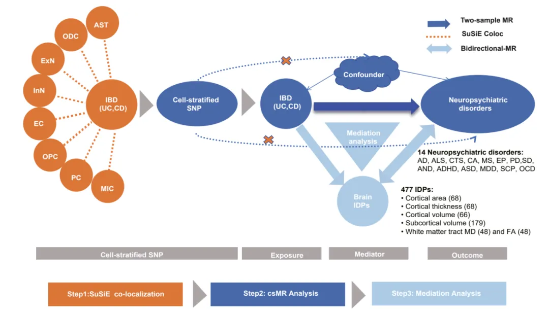 🌟首创细胞分层孟德尔随机化应用:首次将细胞分层孟德尔随机化(csMR)框架应用于炎症性肠病(IBD)与神经精神疾病关联研究,突破传统MR无法捕捉细胞特异性效应的局限,精准定位介导疾病互作的关键脑细胞类型。