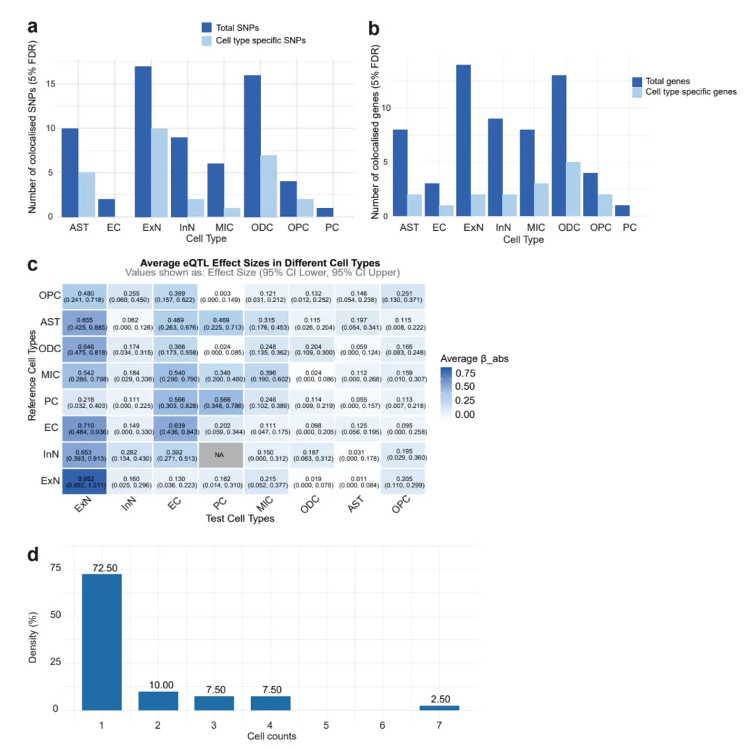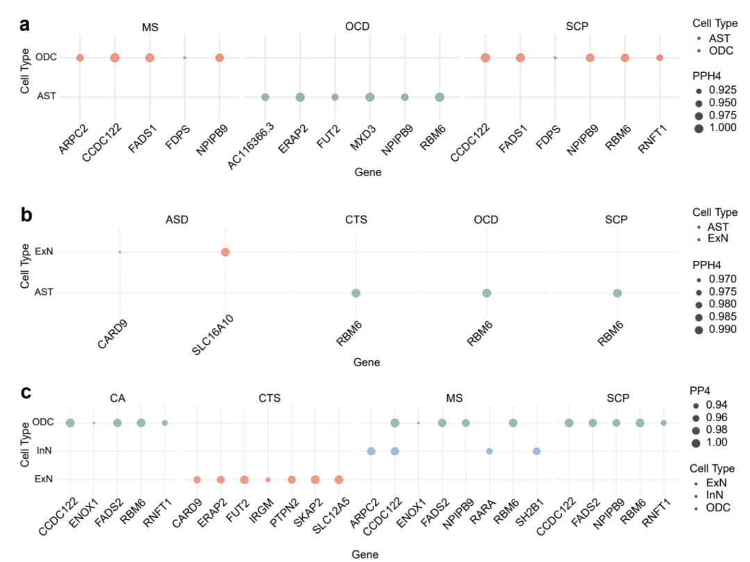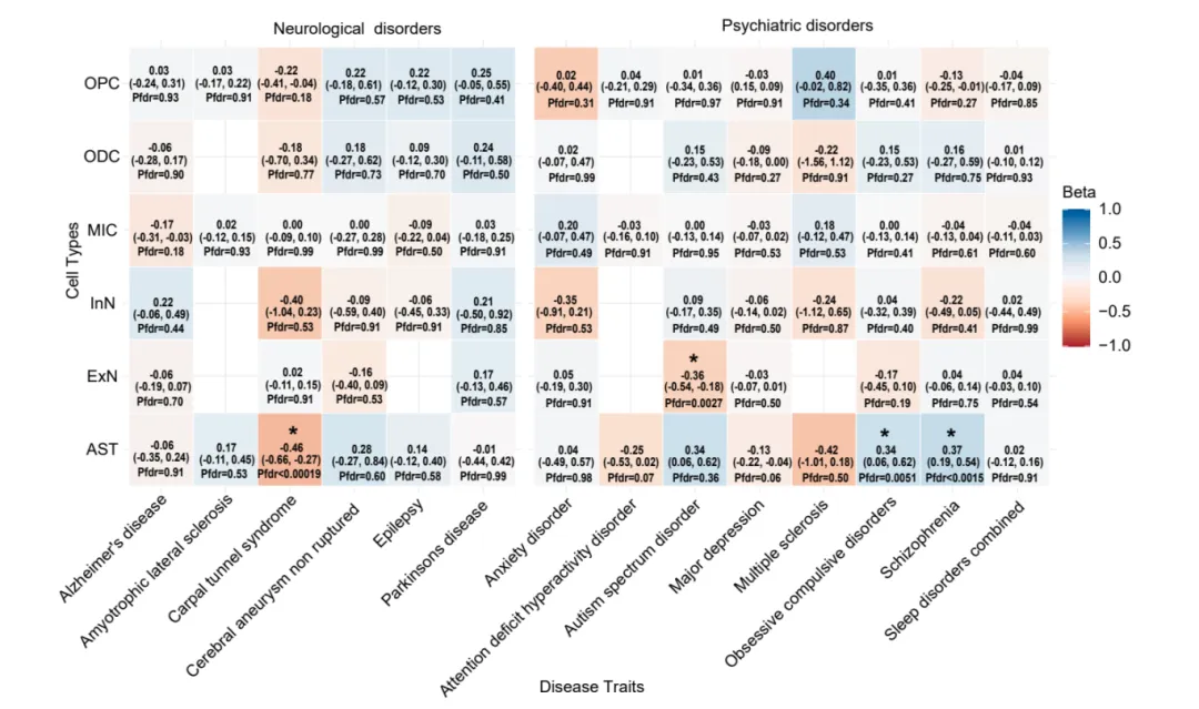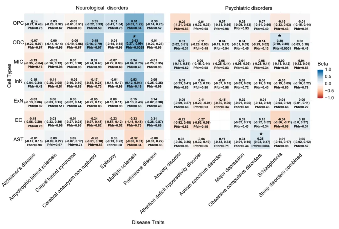 🌟明确细胞特异性因果关联:发现少突胶质细胞分层的IBD风险变异与多发性硬化症、精神分裂症显著相关;星形胶质细胞分层的溃疡性结肠炎(UC)变异与强迫症、精神分裂症相关;抑制性神经元分层的克罗恩病(CD)变异与多发性硬化症相关,揭示细胞特异性致病路径。