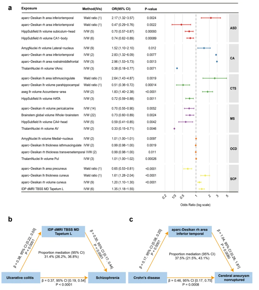 🌟解析脑结构介导机制:通过中介分析明确两条关键路径,左毯状束平均扩散率变化介导31.4%的UC致精神分裂症风险,右颞下回结构改变介导37.5%的CD致脑动脉瘤风险,首次建立IBD-脑结构-神经精神疾病的因果链条。
