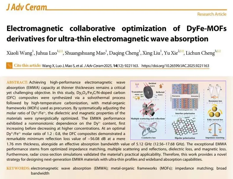 本研究以金属有机框架(MOFs)为前驱体,通过溶剂热法和高温碳化法合成了Dy2O3/Fe3C/N掺杂碳(DFC)复合材料。通过系统调整Dy3+/Fe3+的摩尔比,协同优化了材料的介电和磁性能。DFC的最小反射损耗(RLmin)值在厚度仅为1.76 mm时达到-56.08 dB,有效吸收带宽(EAB)值高达5.12 GHz(12.56-17.68 GHz)。优异的电磁波吸收性能源于优化的阻抗匹配、多重散射和反射、介电损耗和磁损耗。
