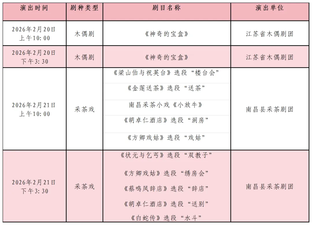 为欢度新春佳节,南昌市文化馆群星剧场倾情推出“文化惠民 • 点单共享”都市小剧场惠民演出活动。正月初四至初五(2月20日-21日)精彩连台!既有阖家欢乐的奇幻木偶剧,也有年味十足的经典采茶戏。诚邀您与家人共赏,在艺术盛宴中共度新春佳节!