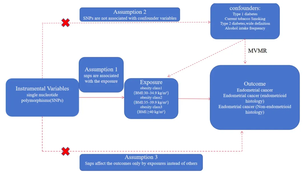 MR 分析以单核苷酸多态性(SNPs)为工具变量,明确肥胖分级(I-III 类)为暴露因素、子宫内膜癌亚型为结局,排除糖尿病、吸烟等混杂因素,遵循 “SNPs 与暴露强关联、独立于混杂、仅通过暴露影响结局” 三大假设,为因果推断奠定基础