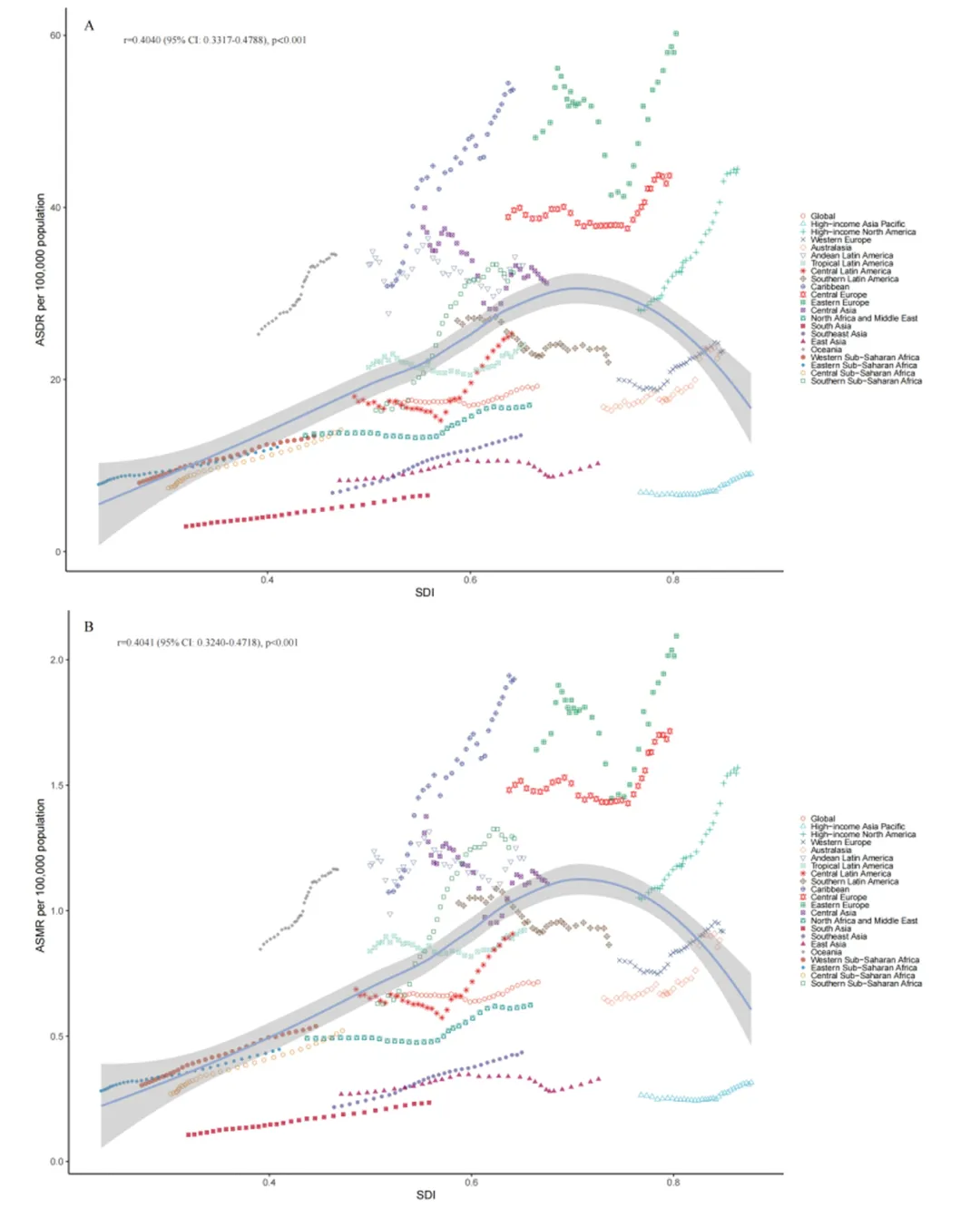 SDI 与 ASDR、ASMR 呈显著正相关(r 均 = 0.404,P<0.0001),高 SDI 国家疾病管理效率缺口更大。