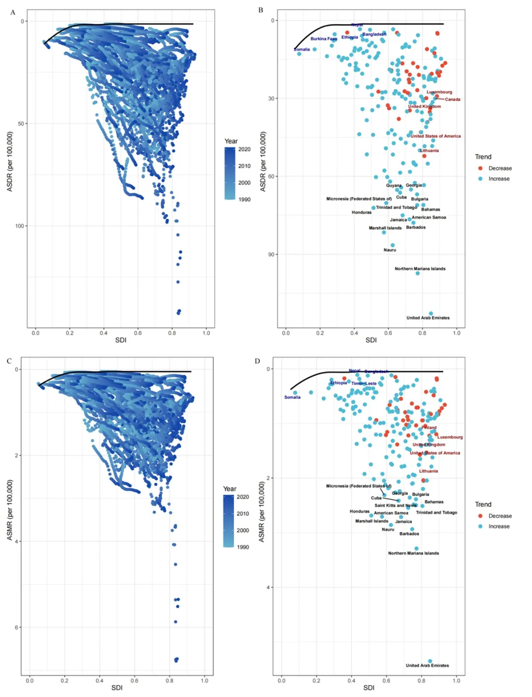 高 SDI 地区负担最重(ASDR 27.91/10 万、ASMR 1.02/10 万),南亚增长最快(死亡率 EAPC 2.58%),中亚呈下降趋势;2021 年阿联酋 ASMR 最高(5.35/10 万),科威特 DALYs 增长最显著(1403.5%),爱沙尼亚、德国呈下降趋势。