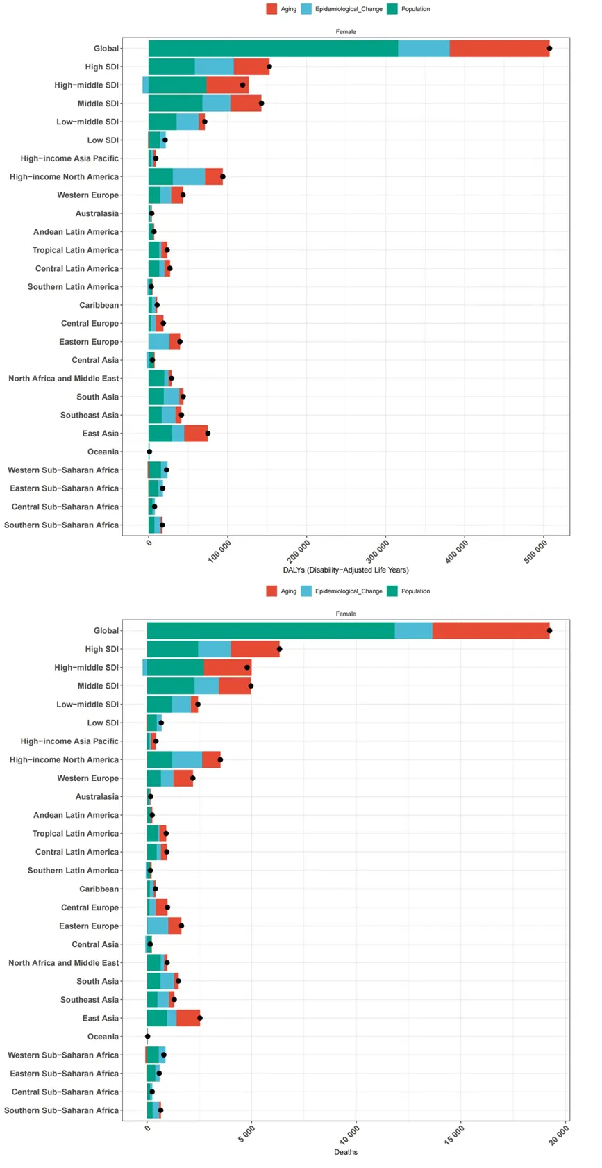 人口增长(DALYs 增长贡献 62.3%)和老龄化(24.9%)是主要驱动因素,高 SDI 地区人口增长影响最突出。