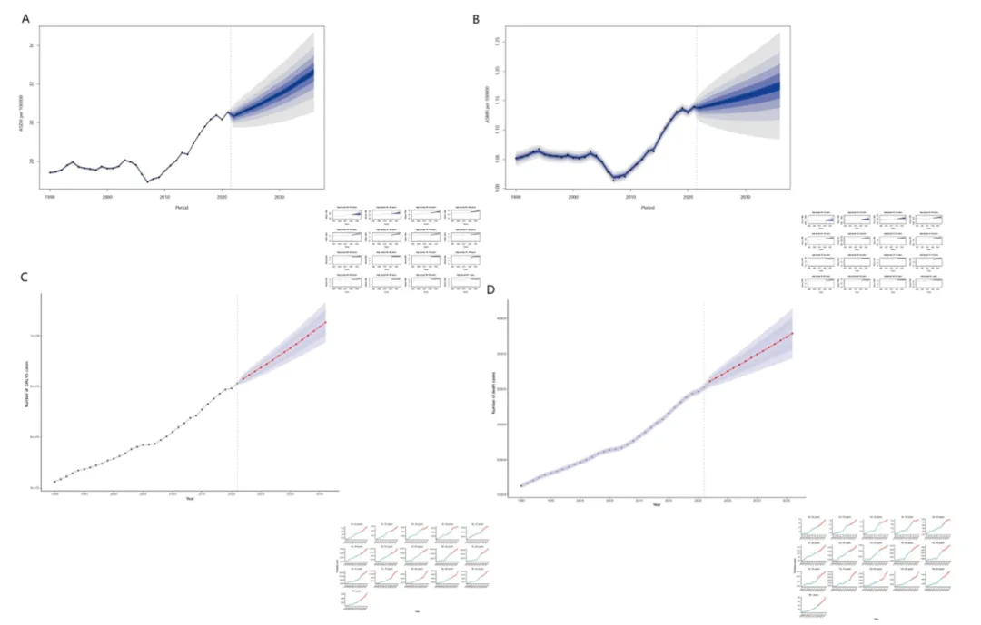 💫死亡率预测受人口老龄化驱动:预计 2036 年该疾病年龄标化死亡率(ASMR)将达 1.18/10 万,95 岁及以上高龄人群死亡率将迎峰值。