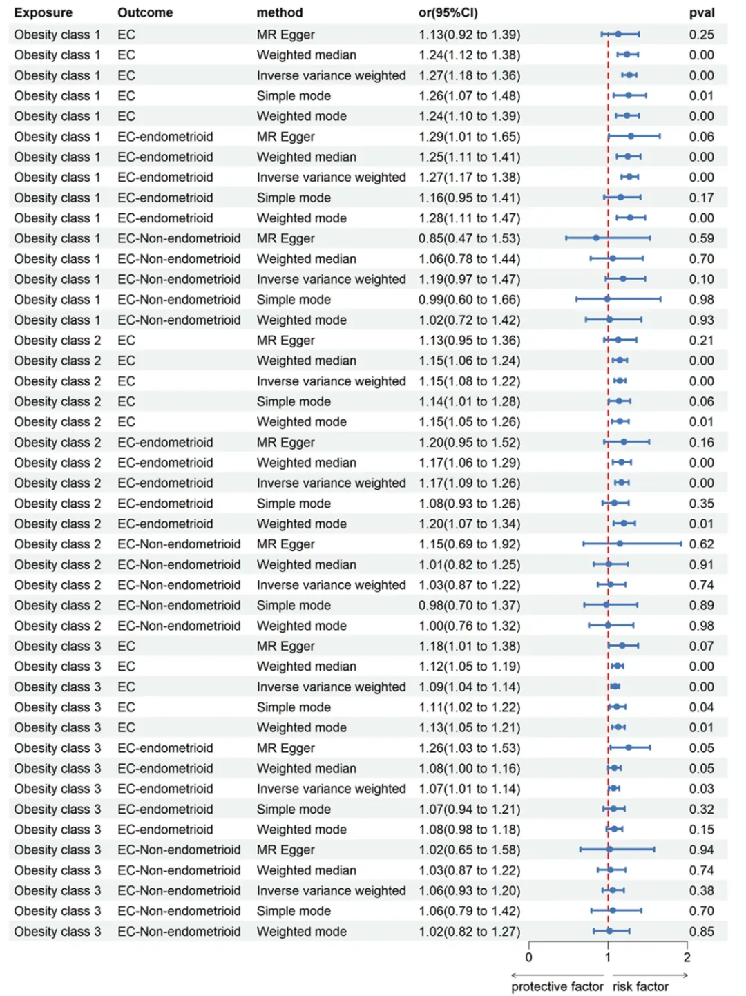 图9.孟德尔随机化(MR)估计,评估肥胖类别对子宫内膜癌亚型的因果关系